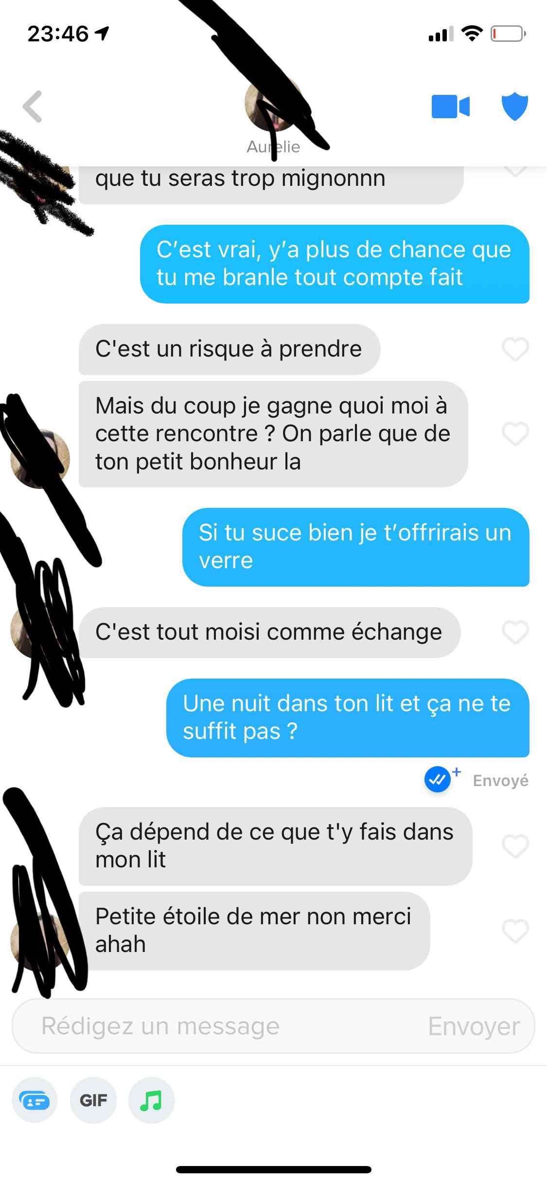 Trop facile. Y’a moyen de faire mieux du genre "Tu mouillera comme une baleine à mon premier regard, j’ai même pas besoin de te toucher pour te faire jouir"
