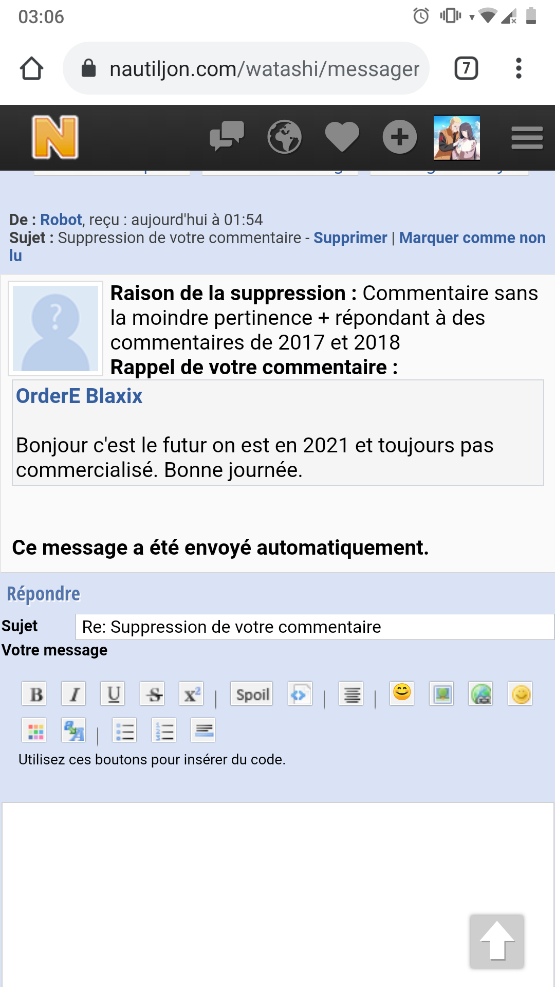En France on est autant des sous merde a ce point pour ne pas avoir un site a nous spécialement sur les mangas l'actus Jap et j'en passe sans te faire skip pas un robot?
