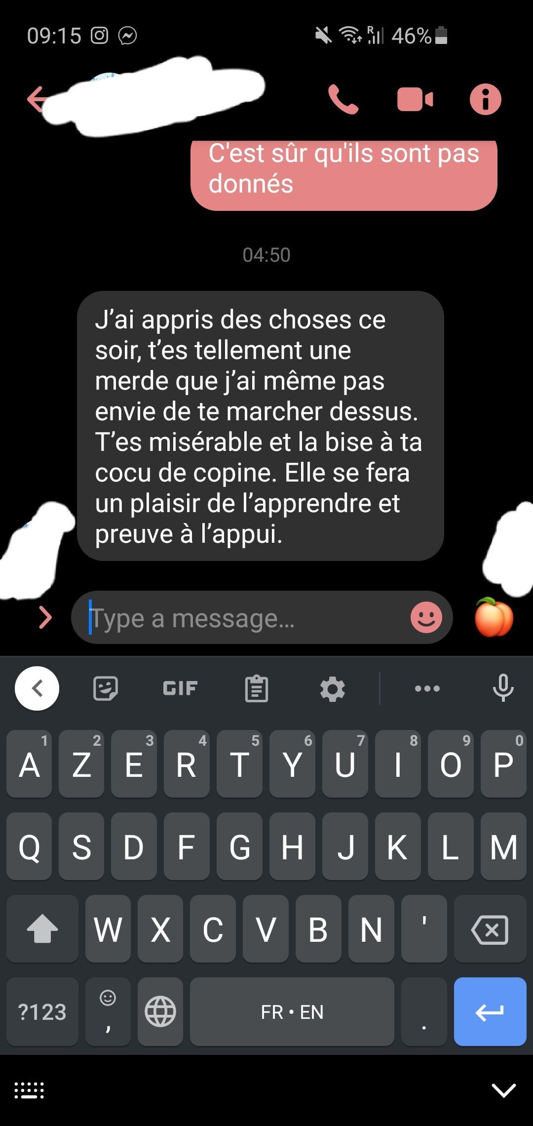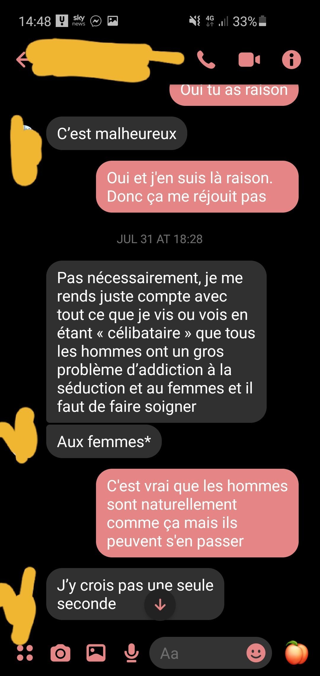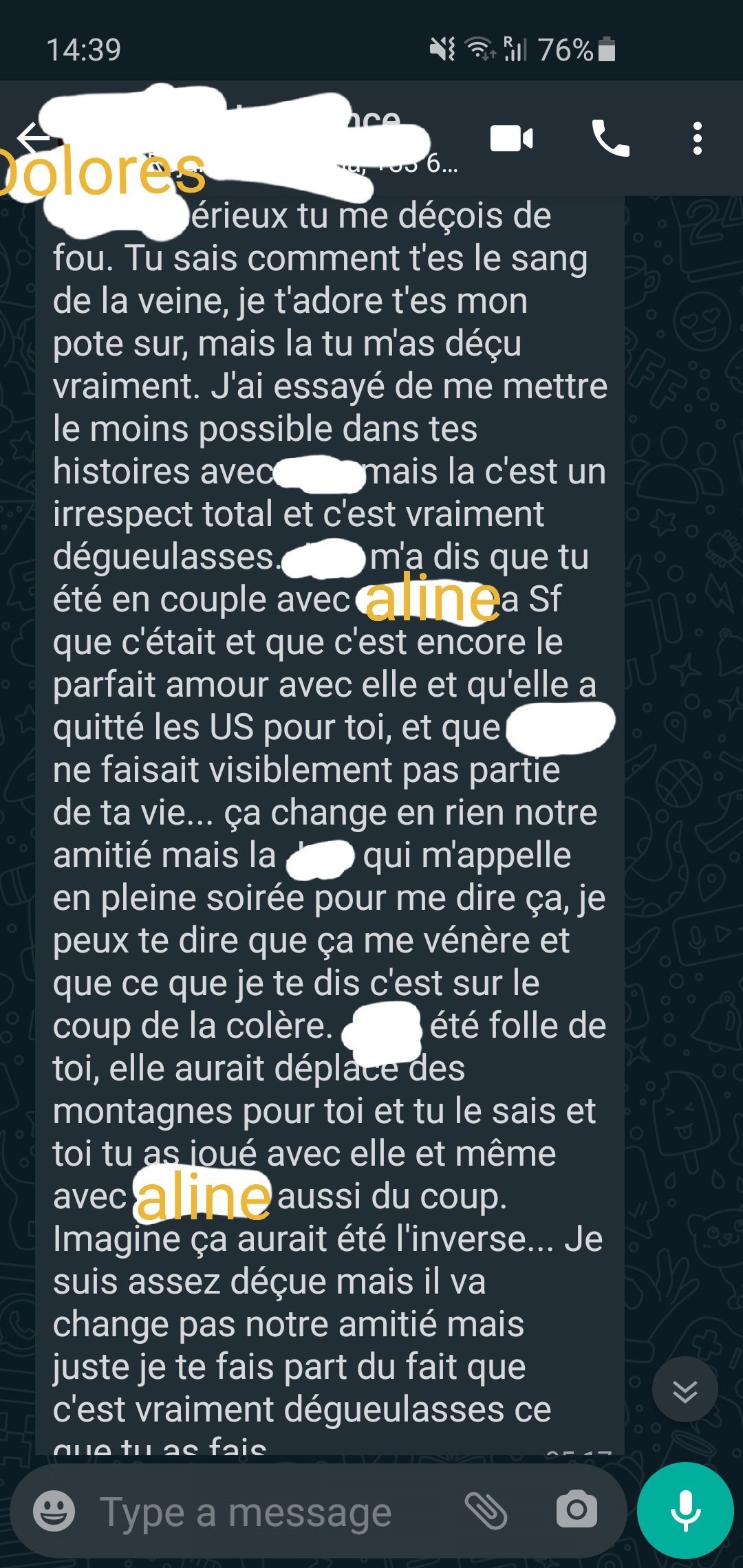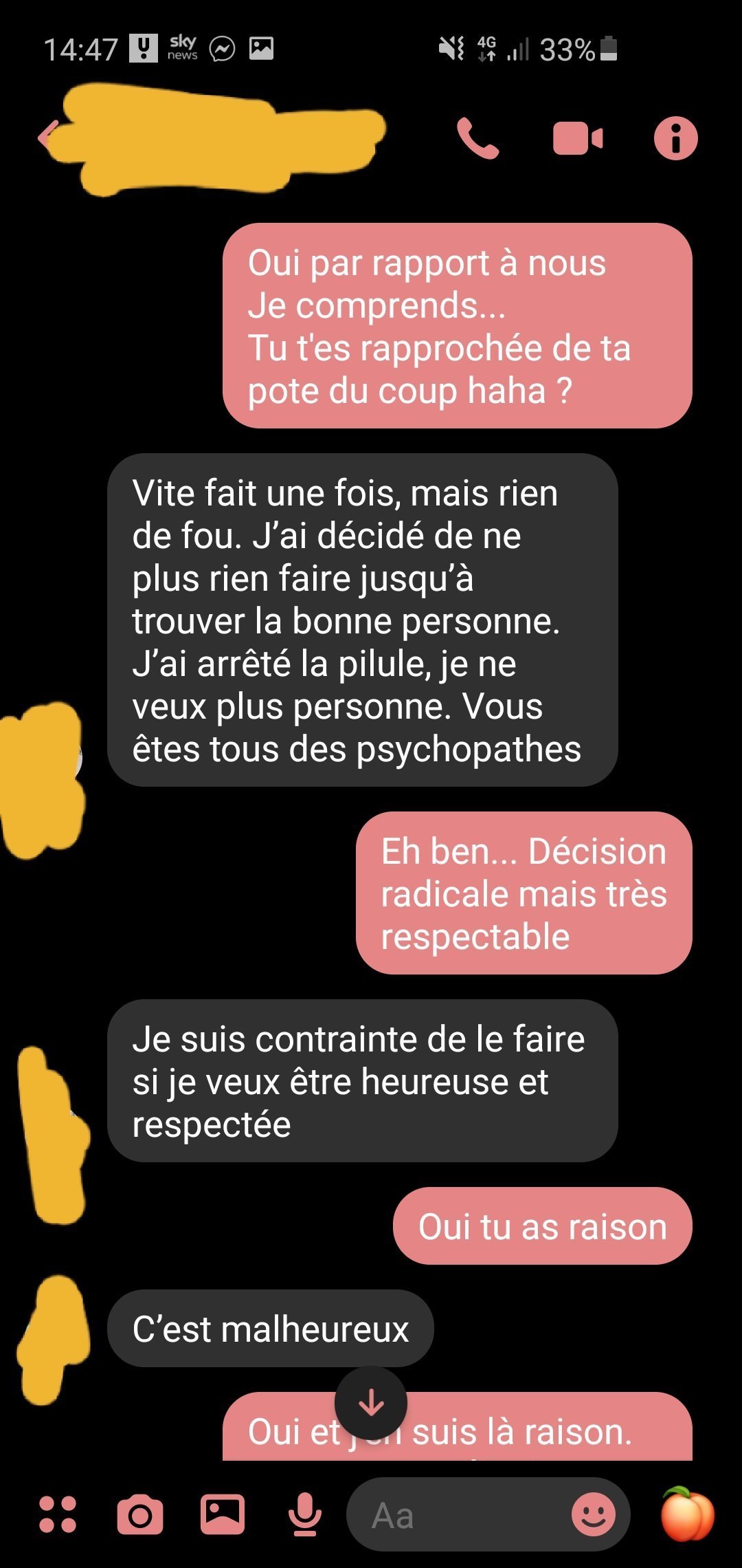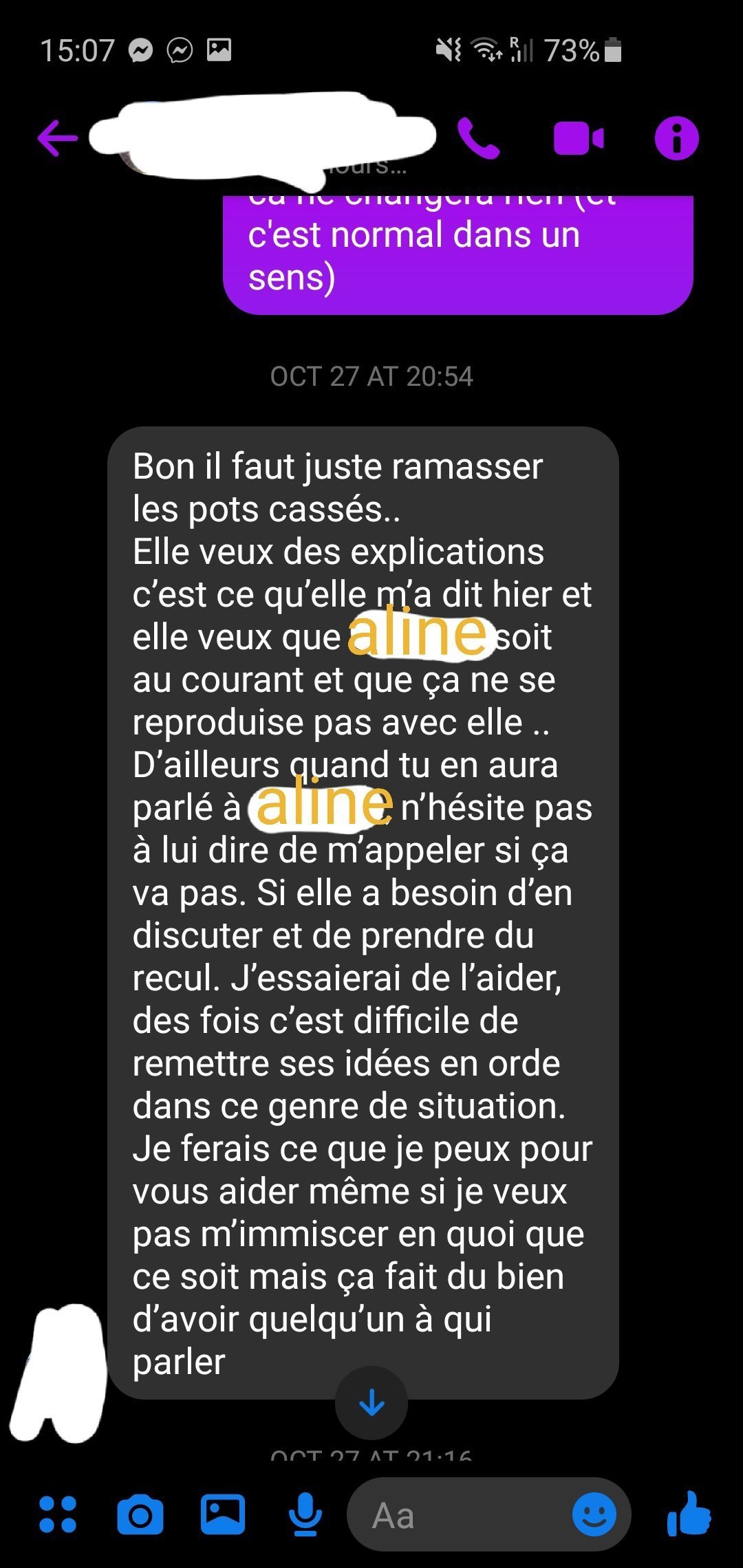 Beaucoup de questions viennent à mon esprit. Et evidemment, j’ai un gros coup de stresse, elle a toutes les preuves du fait que je maintenais qqch avec elle et que je lui mentais. Si elle balance tout à Aline, c'est fini pour moi, j'aurais tout perdu