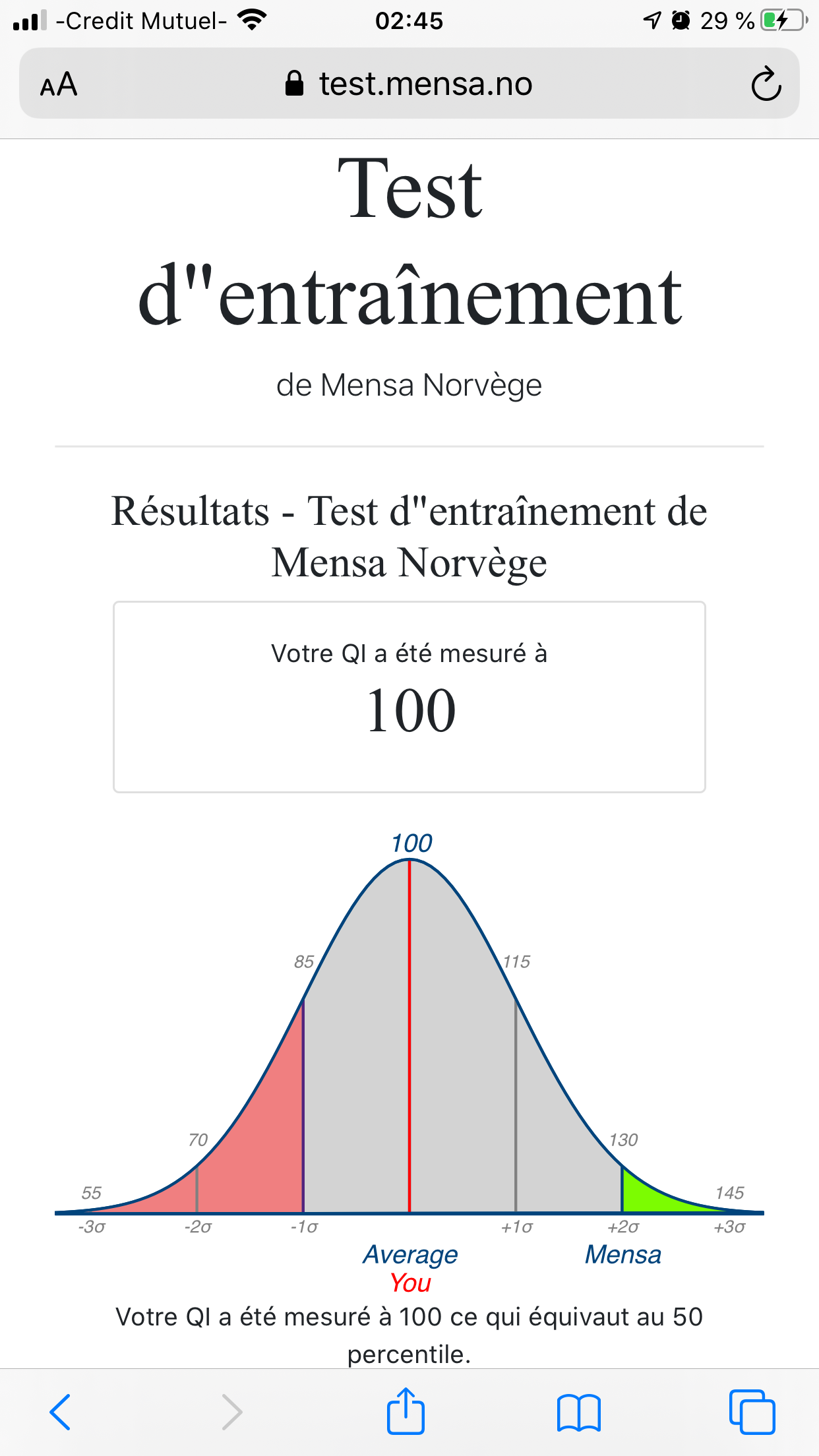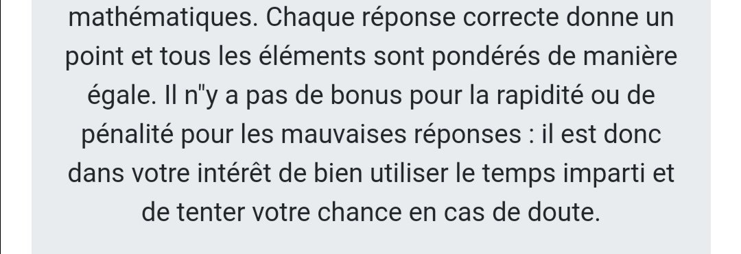 J'ai eu 100 mais ça ma gaver et jai répondu random au bout de la 20 même question vous pensez si jaurais continuer jaurais eu combien ?