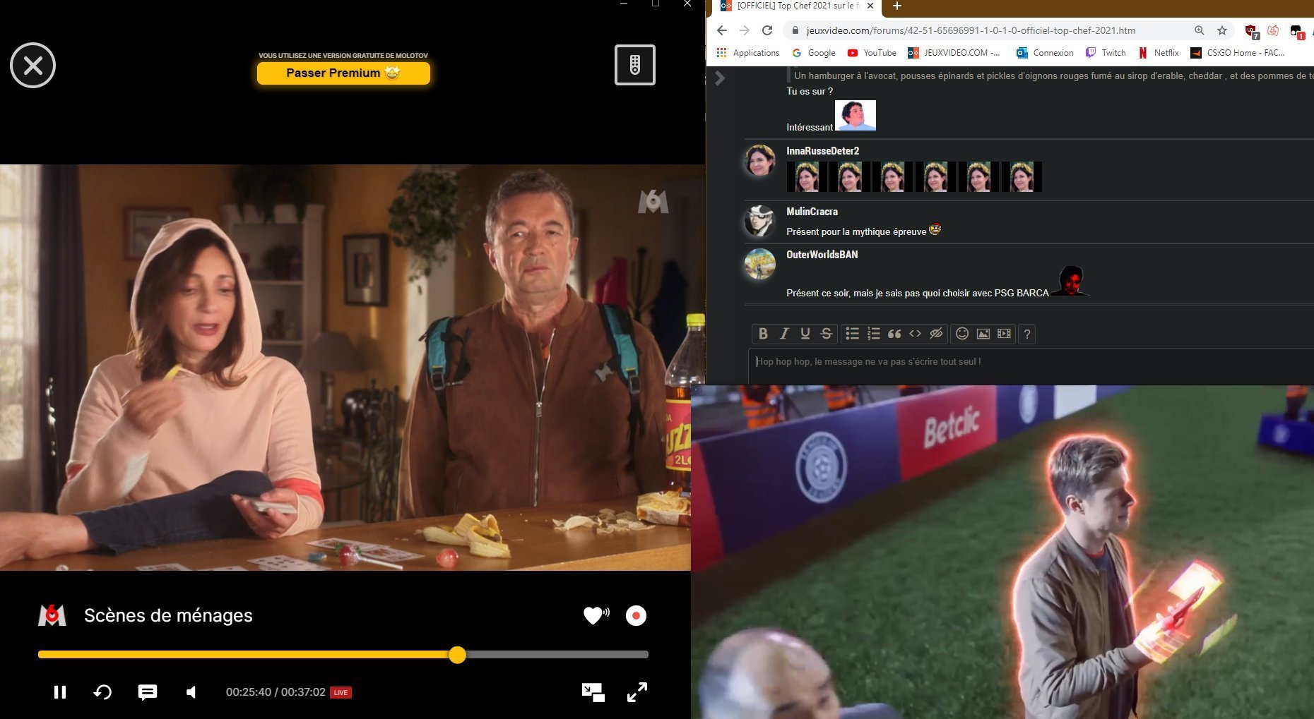 Je suis en train de cuisiner pour manger un truc cool devant ça . Ça me donne toujours faim ce truc.Tu cuisine quoi ?
