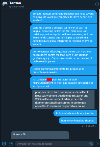 Après ca Tonton envoie un énorme pavé MP Twitter à SirThomas en expliquant gentiment qu'il ne comprend pas la réaction haineuse de SirThomas sur son live et Sir Thomas lui répond avec un gif méprisant https://www.twitch.tv/tonton/clip/TastyEsteemedAirGuitarPeanutButterJellyTime