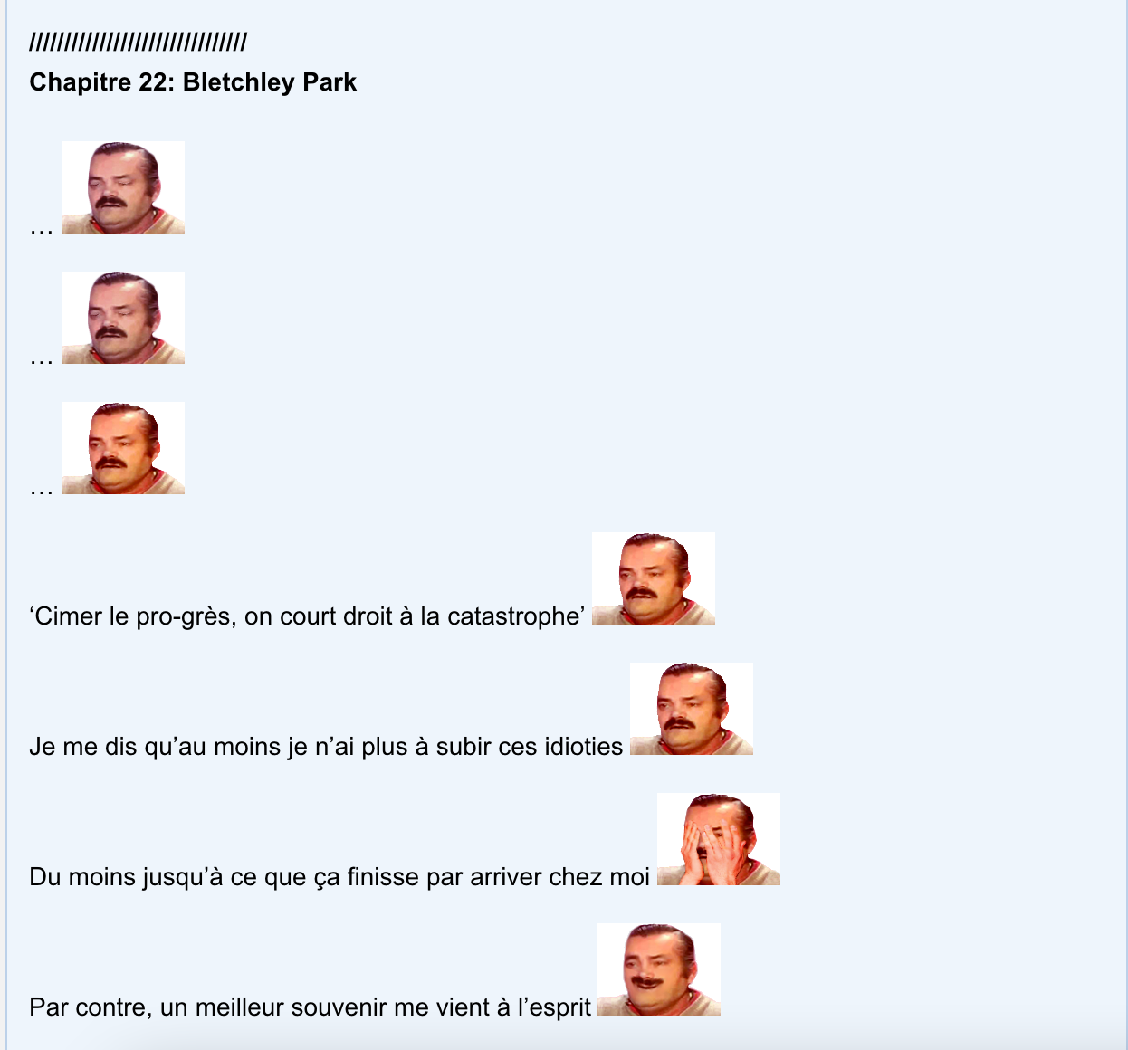 Par contre, j’écrirai aussi des chapitres au sujet de l’absurdité due au progrès. J’avais trouvé ça marquant et parfois, c’est si ridicule qu’il vaut mieux en rire qu’en pleurer