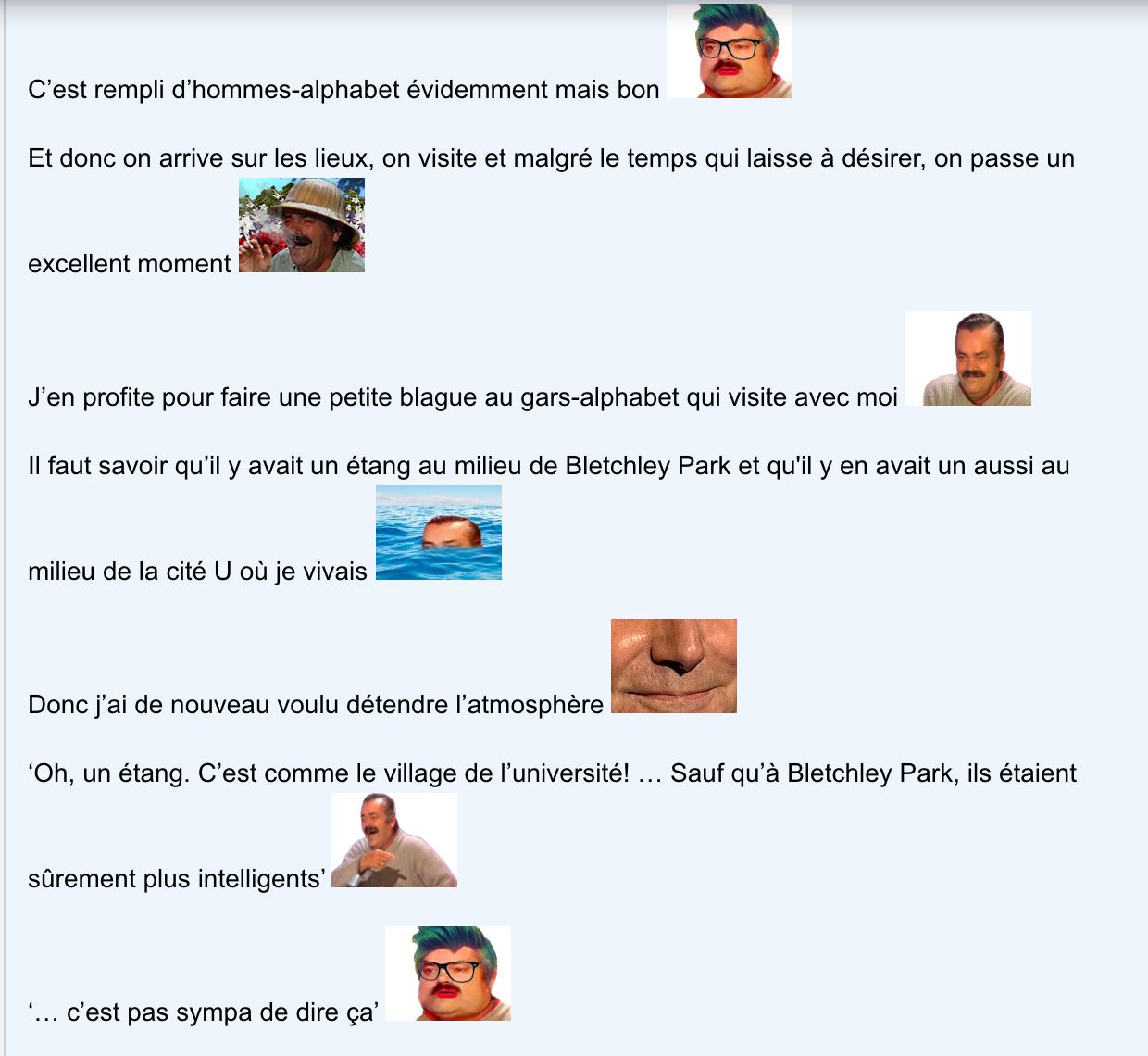 ‘Oh, un étang. C’est comme le village de l’université! … Sauf qu’à Bletchley Park, ils étaient sûrement plus intelligents’