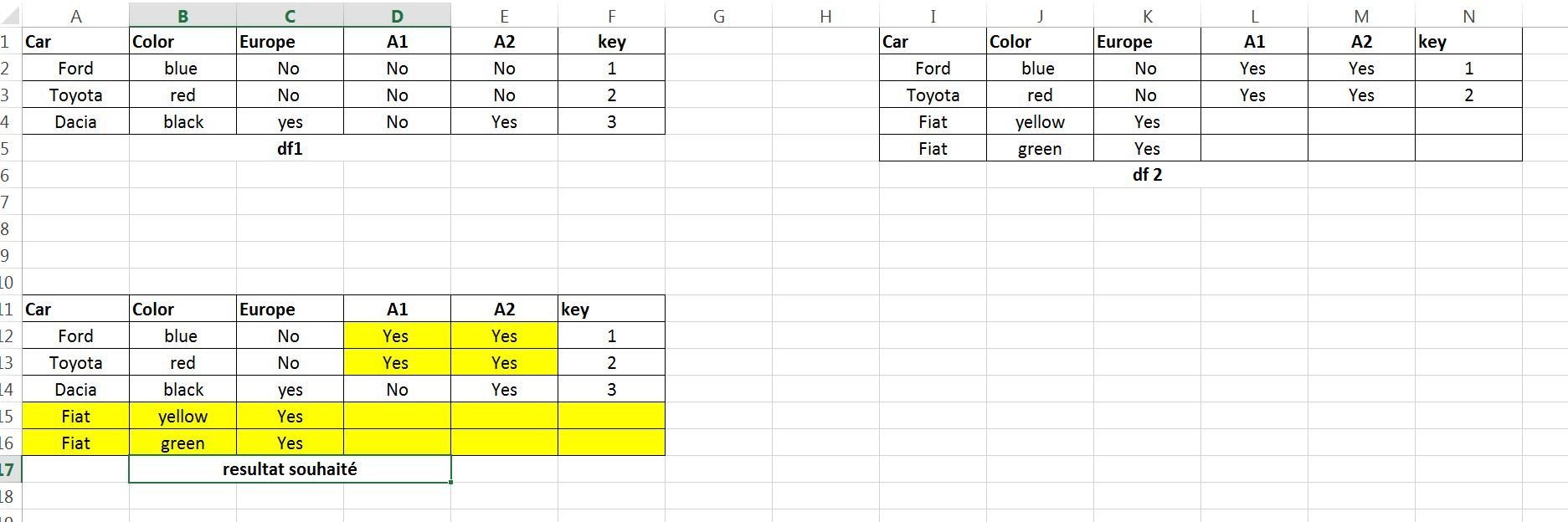 En gros, je souhaite mettre à jour les lignes d'un dataframe (df1) en fonction d'un autre dataframe (df2) sur la base d'une clé mais comme je suis un noob je galère grave.