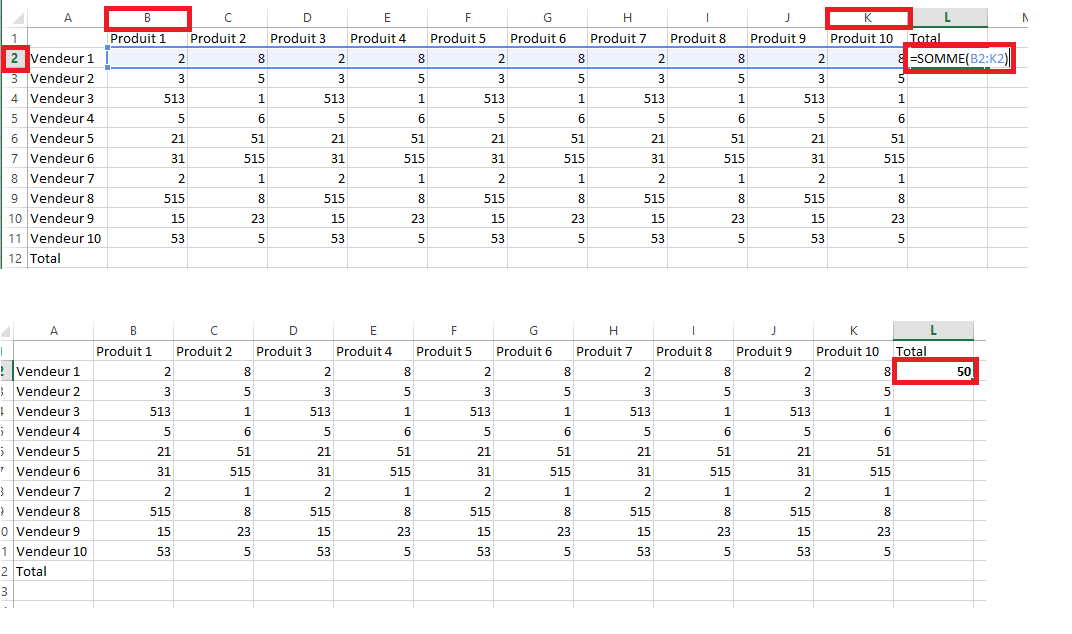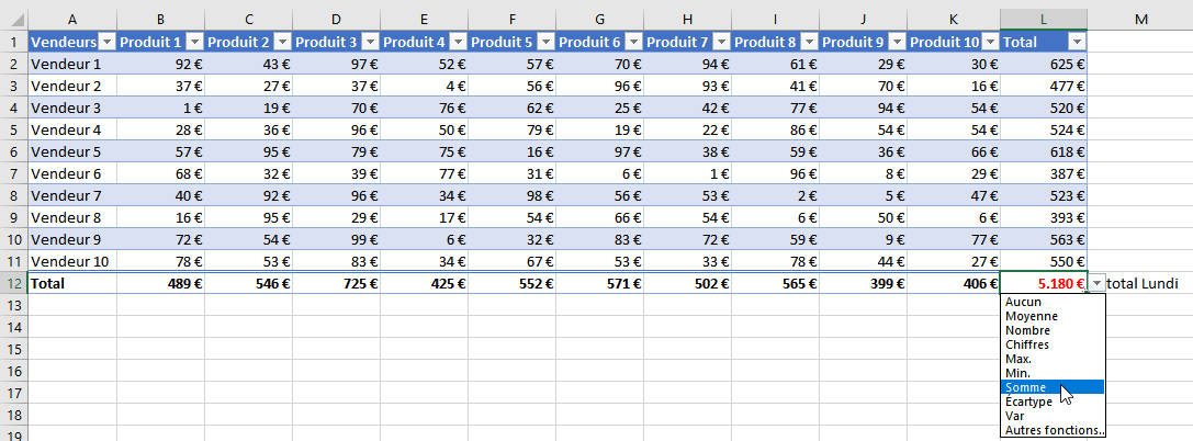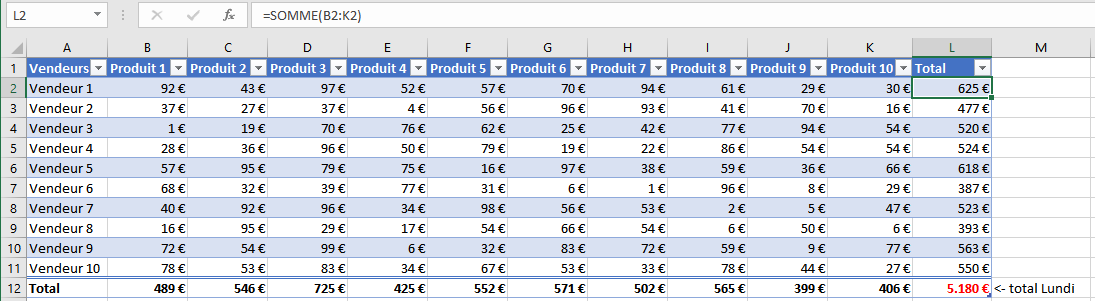 Test pour lundi par exemple.Dans la case total en face de vendeur 1, tu écris : =SOMME(et ici tu sélectionne toute la ligne du vendeur 1 en restant cliqué). Pense bien a mettre les parenthèses