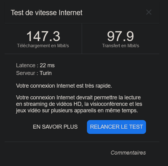 Les speed test en local montent bien au dessus, c'est juste la fibre qui est pété et qui me délivre 200mega au lieu de 1giga, parce-que 1giga c'est le débit théorique qu'on me dit