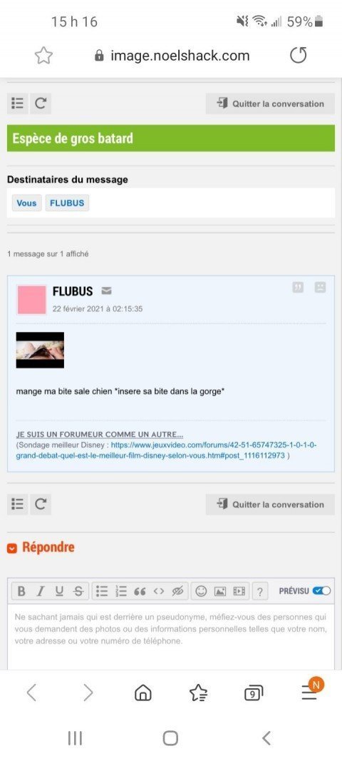 Le 27 février 2021 à 22:49:06 Elfamoszbob a écrit :Le 27 février 2021 à 22:47:50 67839118 a écrit :Le 27 février 2021 à 22:47:12 Elfamoszbob a écrit :Envoi le screen par mail à la modération + signal gouv leLe mail ?Laisse tomber il est protégé c'est vrai