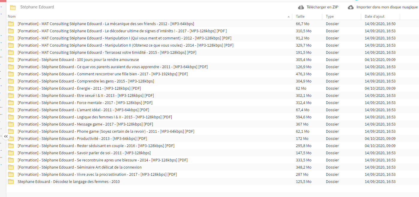 Salut les Kheys ! Je possède l'intégralité des séminaires de Stéphane Édouard. J'ai également les contenu de Nicolas Dolteau, de Jean Marie Corda et de Jean Sommer... et d'autres contenus de développement personnel. Si vous êtes intéressé pour les acquérir, je suis très ouvert pour les échanger contre d'autres contenus de qualité si tu vous en avez.. ou bien je peux te les vendre à bas prix, : les séminaires de Stéphane Edouard je les vend 20€ pièce... C'est cadeau quoi ! Ecrivez moi sur mon mail et je vous enverrai ma liste exacte de contenus... Vous aurez un énorme choix ! Mon mail : mailto:[email protected]
