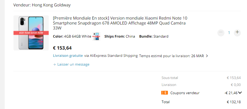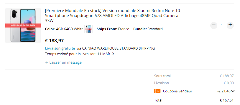 Tu te fais baiser pour le Redmi Note 10 normal, il faut prendre le vendeur Telplus il le fait à 159e expédié de FRANCE