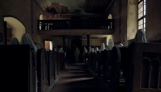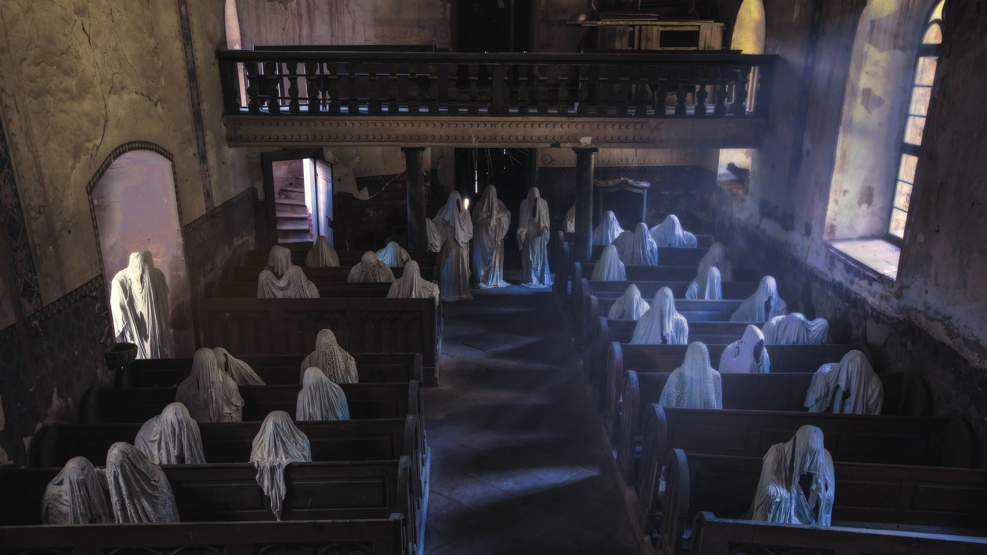 des gens totalement voilés immobiles et une mélodie d'orgue somptueuse résonner dans la pièce