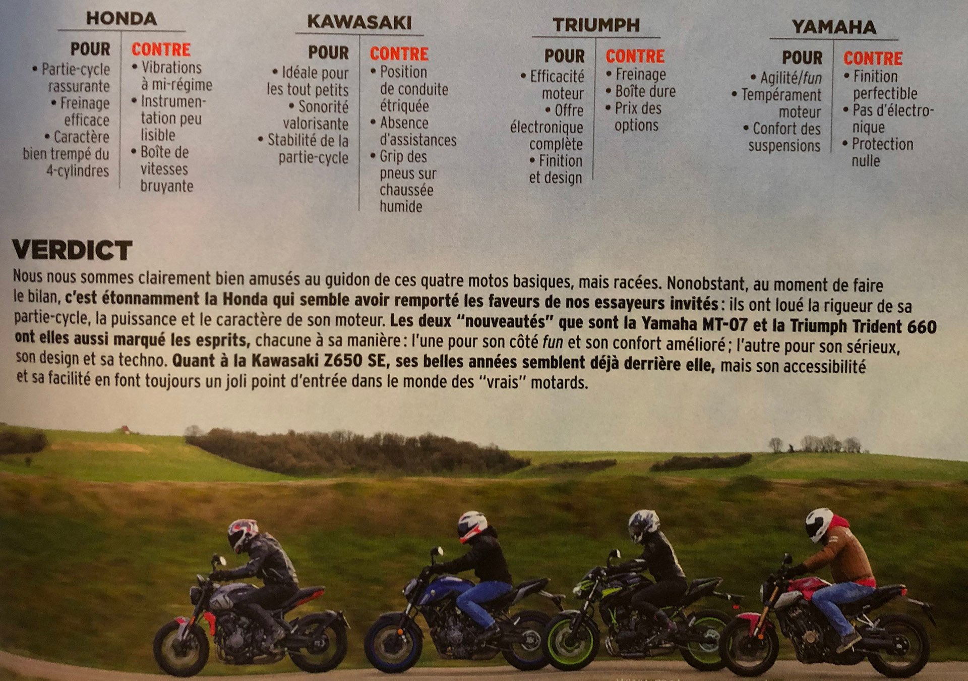 En gros leur classement de la meilleur à la moins bonne : CB650R, Trident, MT et Z650