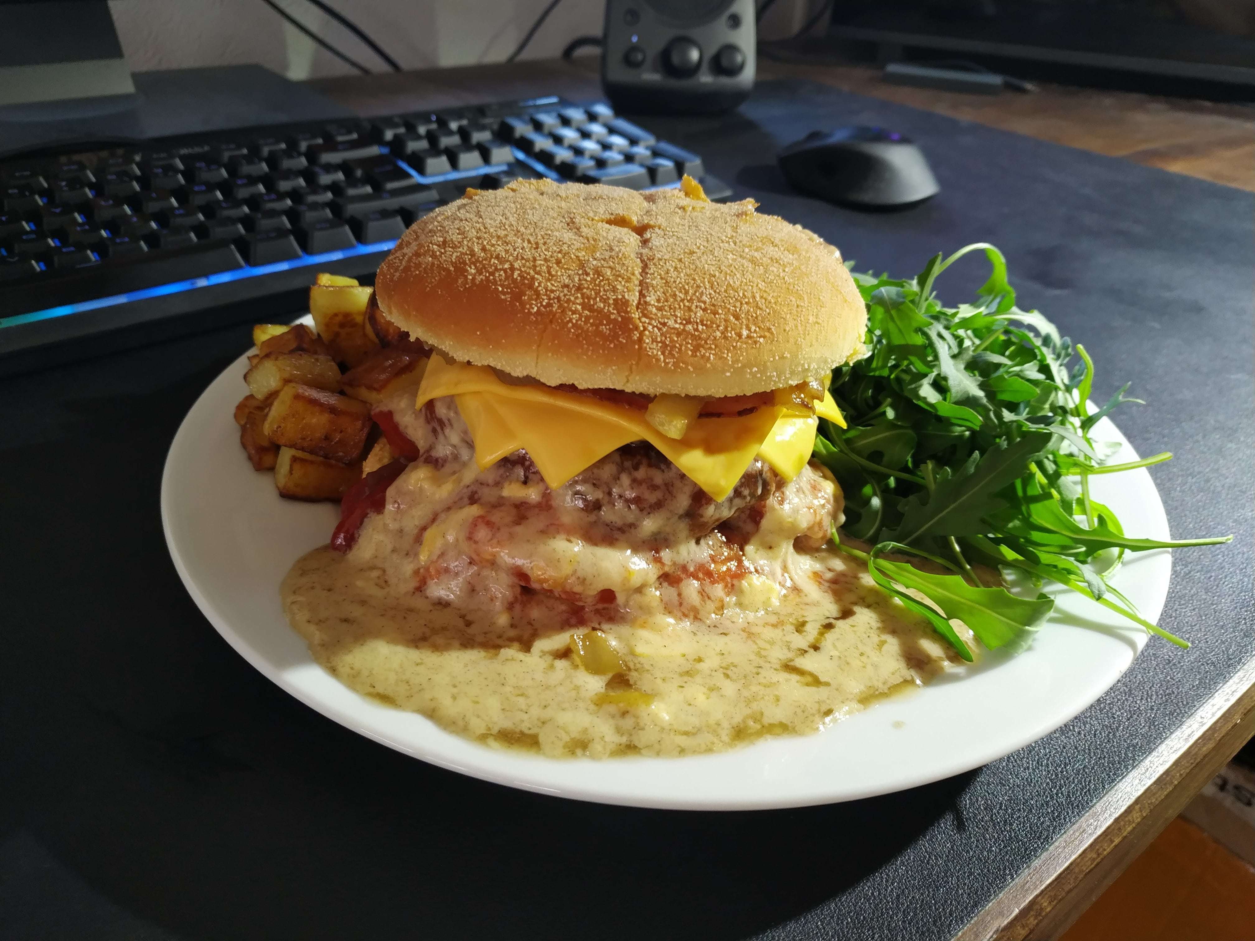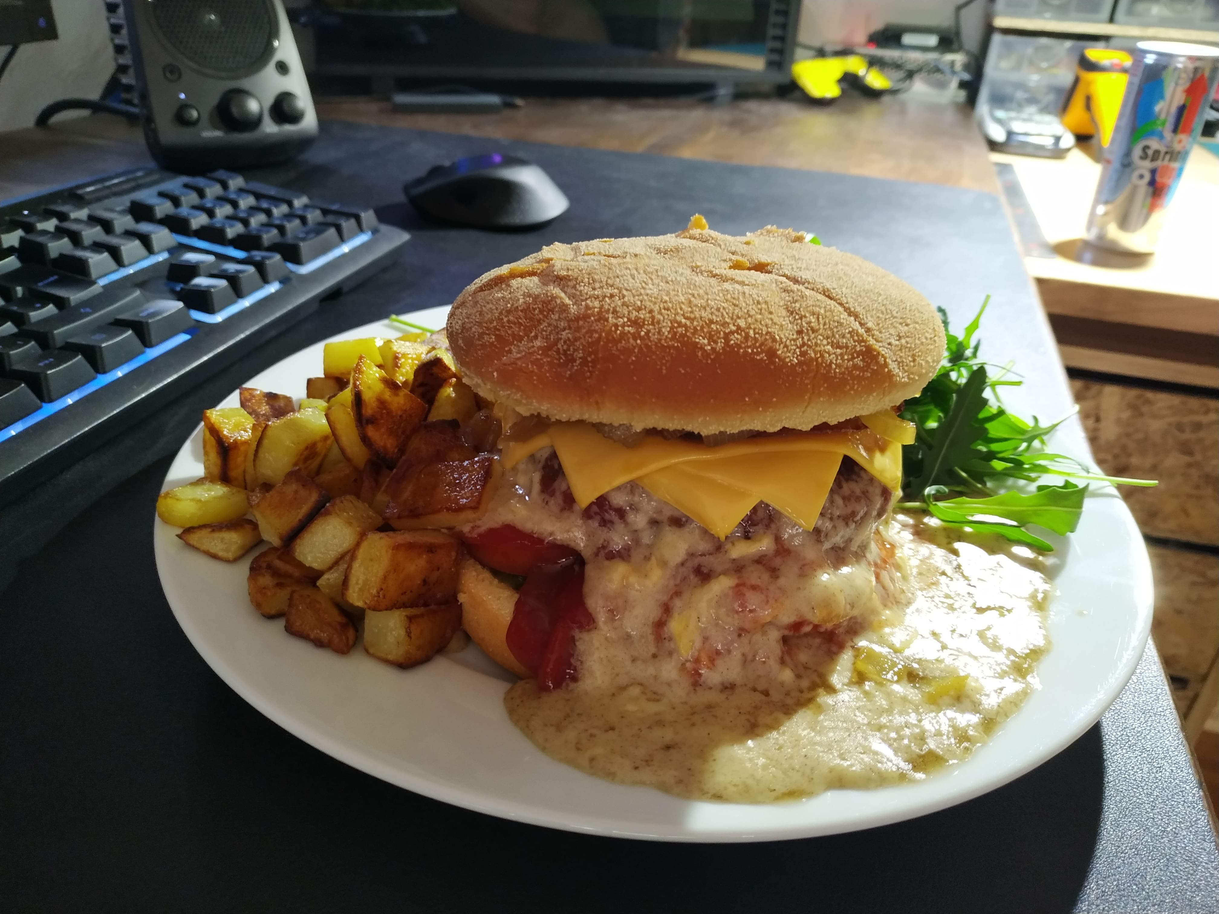 1 confit d'oignon maison3 tranches de bacon3 tranches de cheddar1/4 reblochon de savoie / emmental / creme1 steak 15% mg1 tomateketshup1 cornichon géant