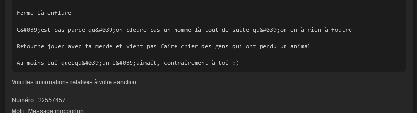 J'ai écris ça sur un coup de tête mais j'ai bien compris que ces gens aimaient un minimum les animaux, mais voilà ça fait de la peine le peu de compassion que j'ai eu de sa part, en plus j'ai eu un peu de retard et il me l'a fait remarquer 2 fois.