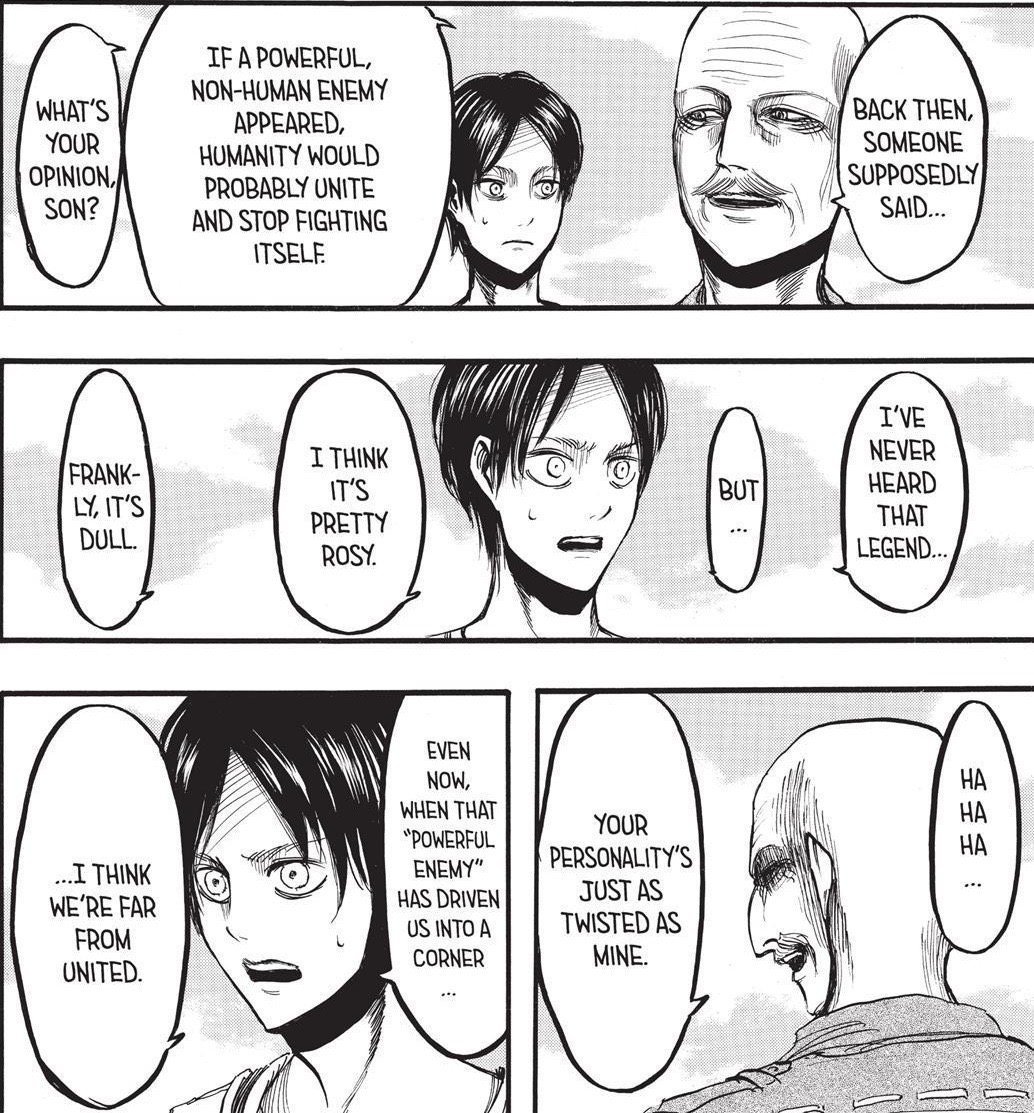 En revanche, dans Watchmen, c'est un alien qui sort de nulle part officiellement et qui menace tous les pays. Dans SnK, le "monstre" est dans un des camps, donc ça ne peut pas oeuvrer comme un rassembleur de toute l'humanité.