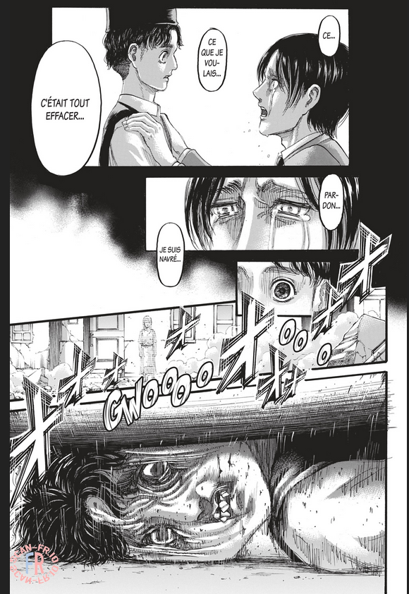 Faire faire un rêve random à un personnage dans lequel il se passe une scène vue plus tôt c'est pas du foreshadowing, ça donne surtout l'impression qu'Isayama ne savait pas du tout comment caller cette scène avec le "See you later" de Mikasa