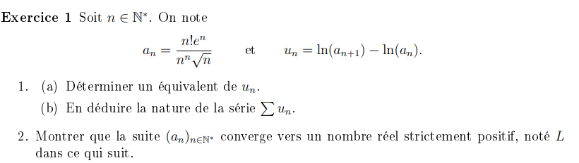 J'ai pas de feuille ni de papier sous la main c'est quoi l'expression exacte de ln(a(n+1))-ln(a(n)) que t'obtiens ? je dirais que c'est un truc genre en ln(e * (1+1/n)^n * sqrt(1+1/n)) non ?