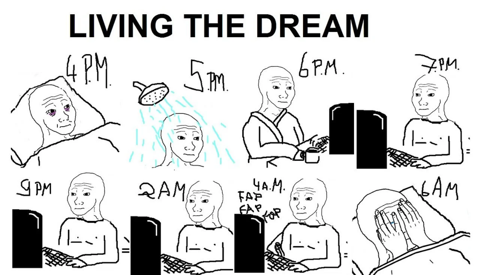 - Aller chez le psychiatre- Recevoir sa dose de médicaments // cannabis- Rentrer chez soi- Attendre que le RSA tombe tout les mois- Regarder Pornhub // JVC