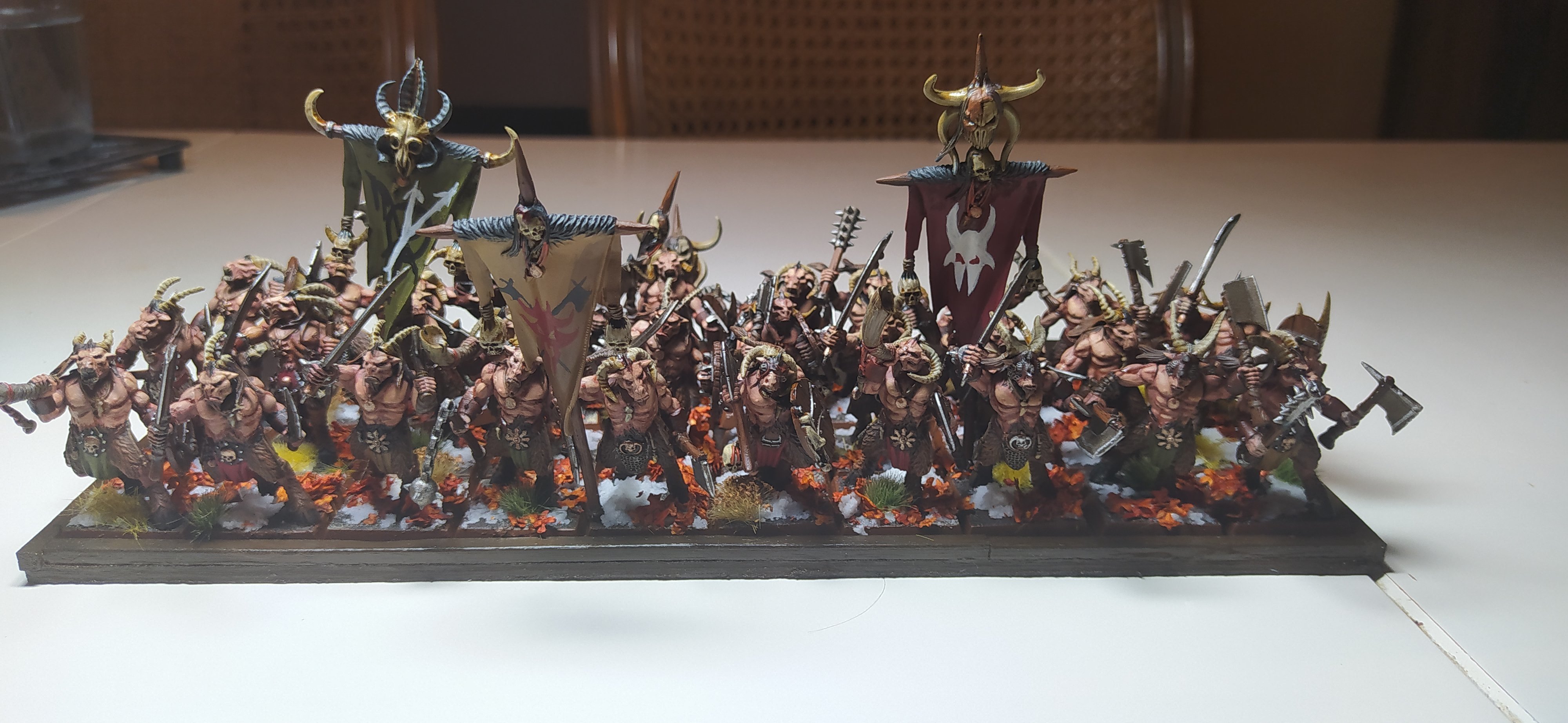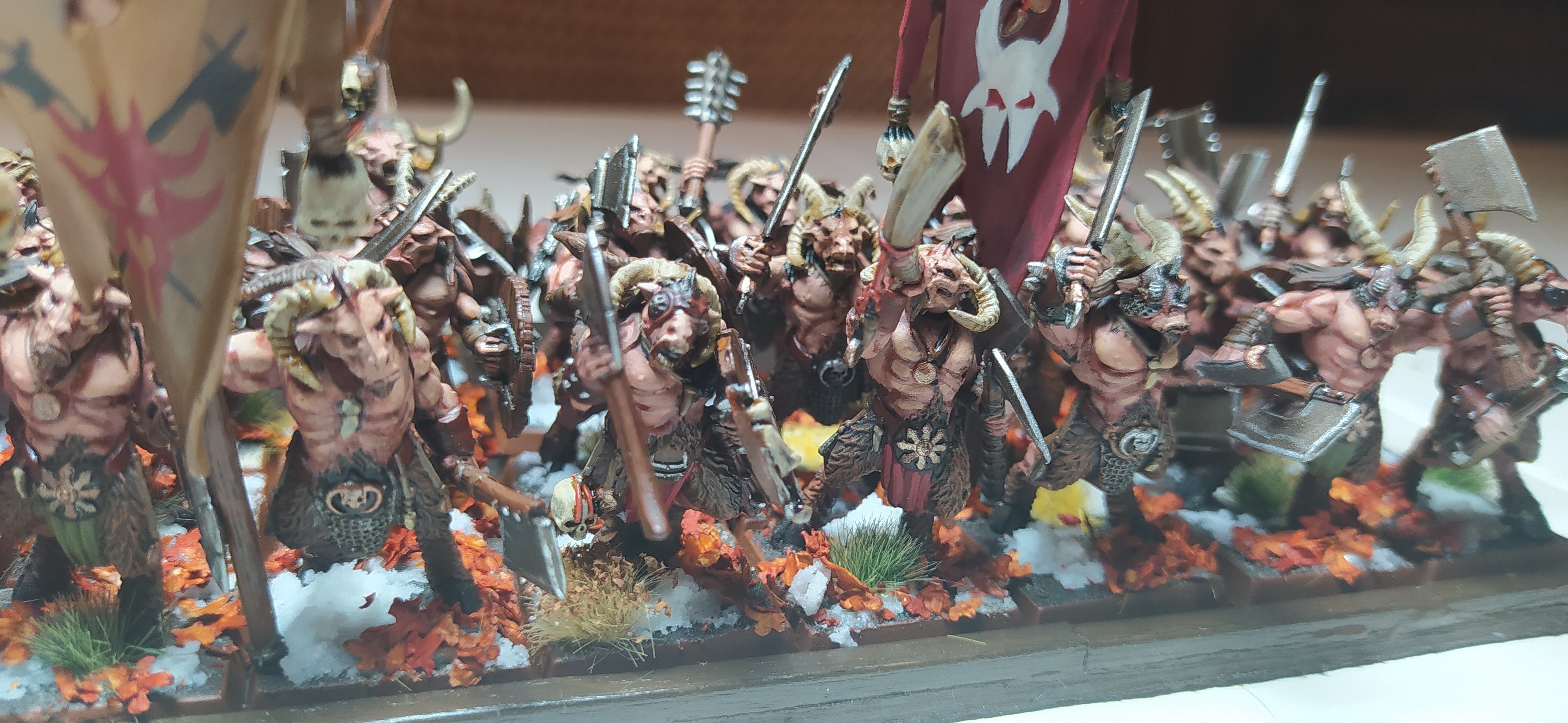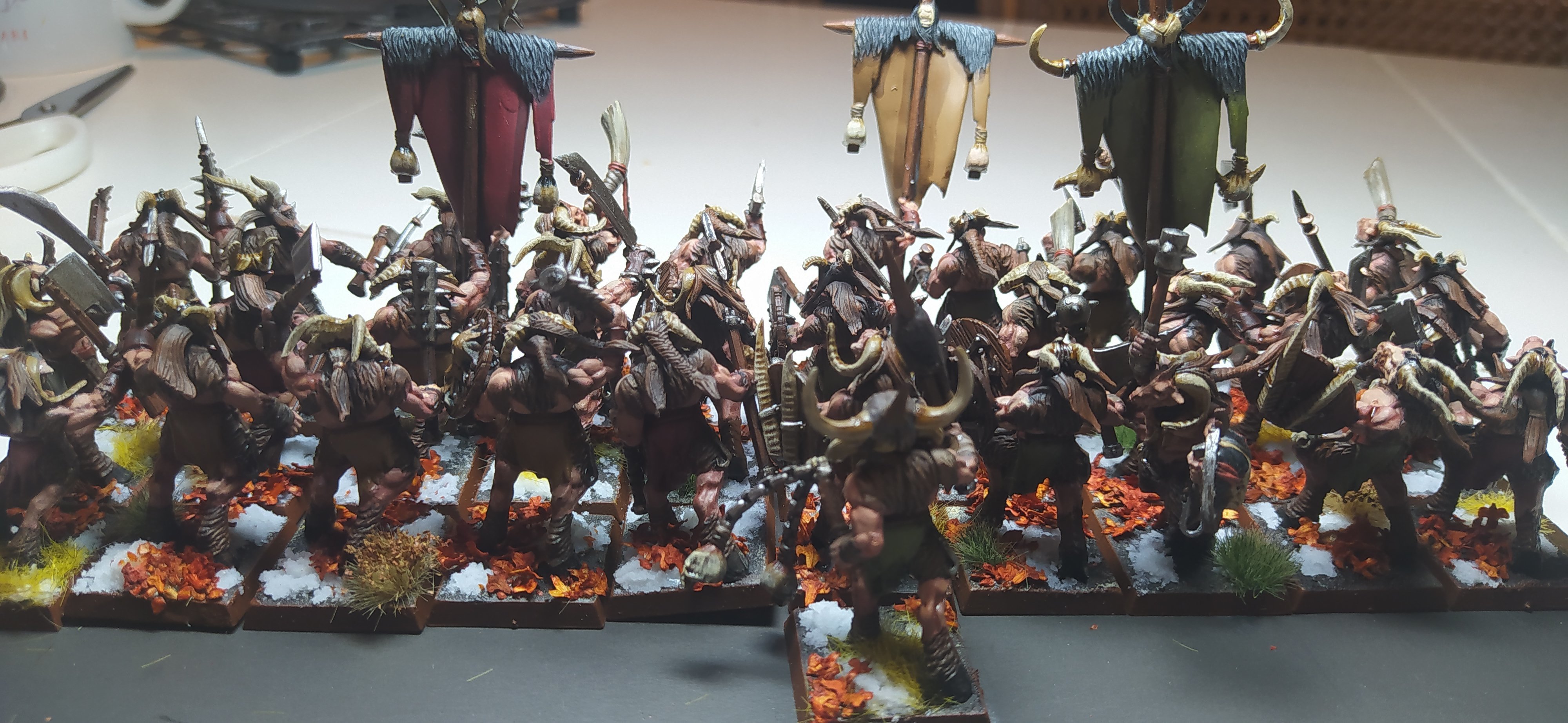 Pas spécialement enthousiaste quand je peignais ces figurines, les ombrages et les éclaircissements sont super importants du coup faut quand même pas mal faire gaffe à la façon dont on brosse et détoure lors des éclaircissements (quoique les boucliers sont très funs à peindre), mais le résultat est bien satisfaisant. Je préfère peindre leurs héros sinon, bien plus de détails et de couleurs.