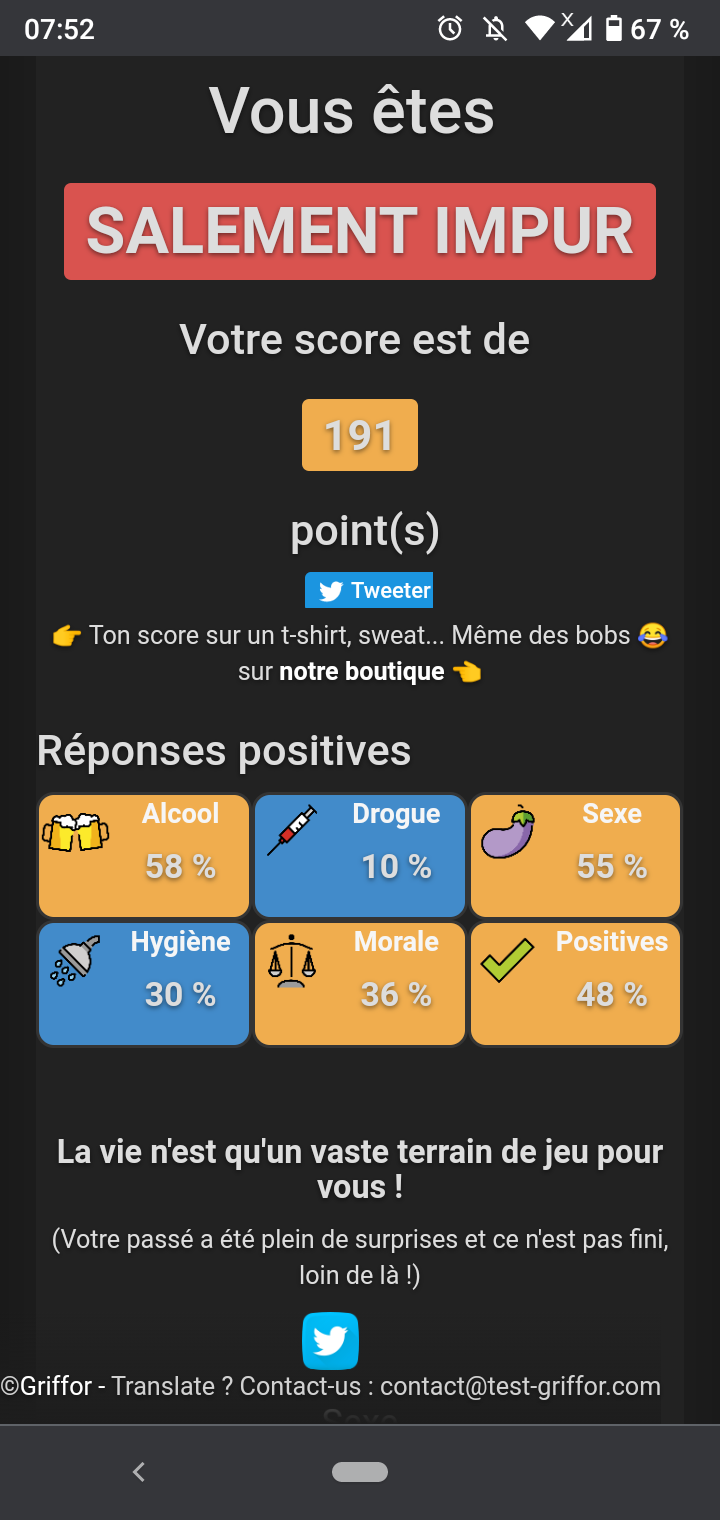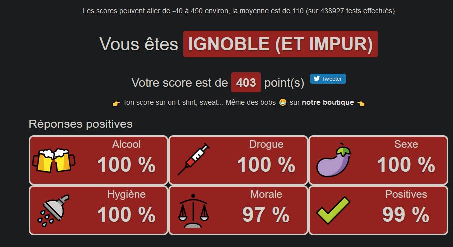 Les questions "as-tu déjà penser à des trucs zoophile " et "ken avec une perdoonne de ta famille " ET "pisser sur ta partenaire" tu as donc mis oui ?