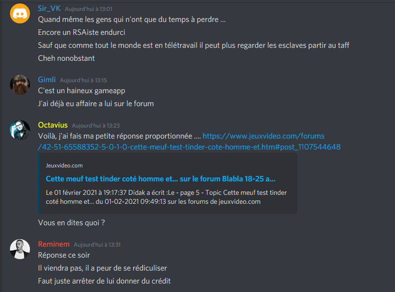 Quel est le rapport? Je te parle des topics tinder et toi tu me parles de son discord... T'es matrixé gros.