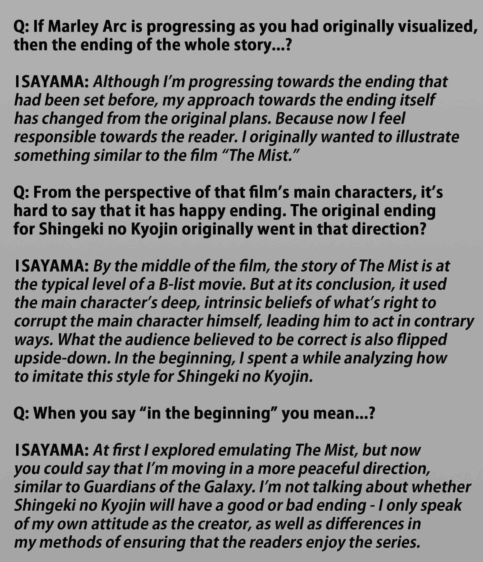 L'histoire est devenue manichéenne depuis l'assaut sur Mahr vu que les gens étaient pro-Eren, il a donc pourri volontairement son camp pour faire une fin GotG, il le dit lui-même