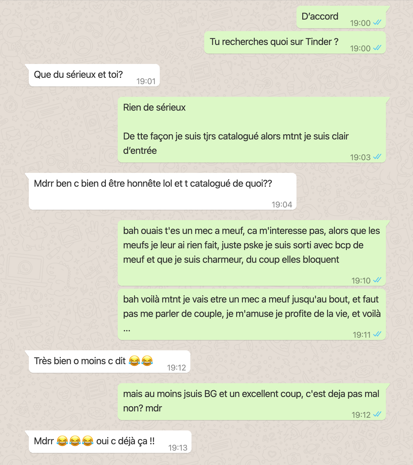 Il lui à dit naivement que "j'étais un coureur de jupon qui serre plein de meufs" ( ce qui était vrai ) ... Alors que pour une fois j'étais interessé pour du sérieux avec une fille, et que j'ai été respectueux avec elle.