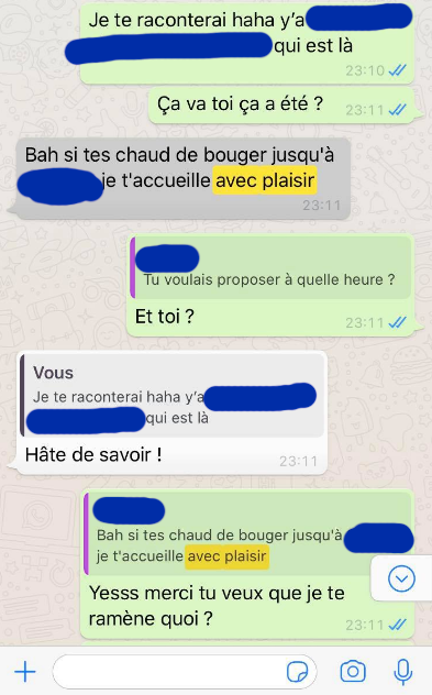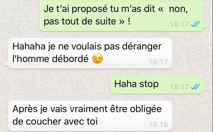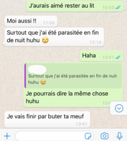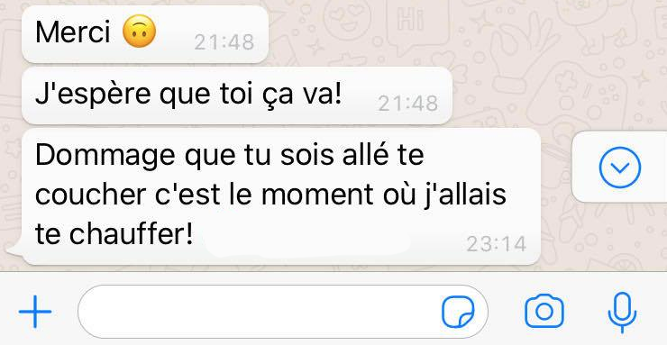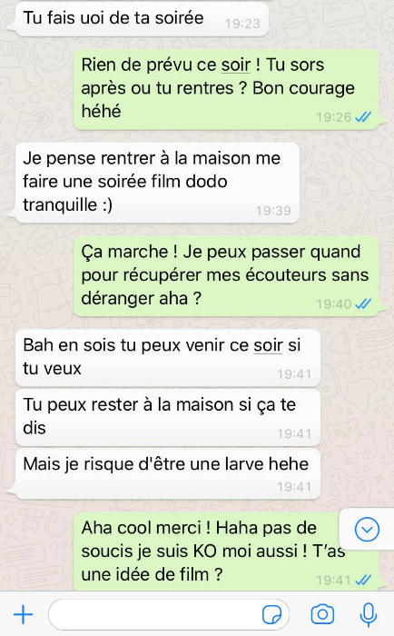 Meuf en couple que je charbonne par message depuis une semaine,une pote de pote. Elle se détache doucement de son mec, et "devient folle à force de voir personne". On s'écrit du matin au soir. Un coup elle veut que je passe, un coup repousse. Je lui demande pourquoi, elle me répond ça :