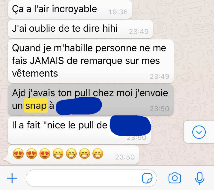 Une meuf qui me dit qu'elle porte fièrement un pull que je lui ai laissé (il s'est jamais rien passé entre nous mais si elle m'envoie ça c'est qu'elle m'aime bien. C'est une meuf cool, dommage qu'elle utilise snapchat, cette appli pétée. Interdit d'utiliser snapchat, on laisse ça à la banlieue