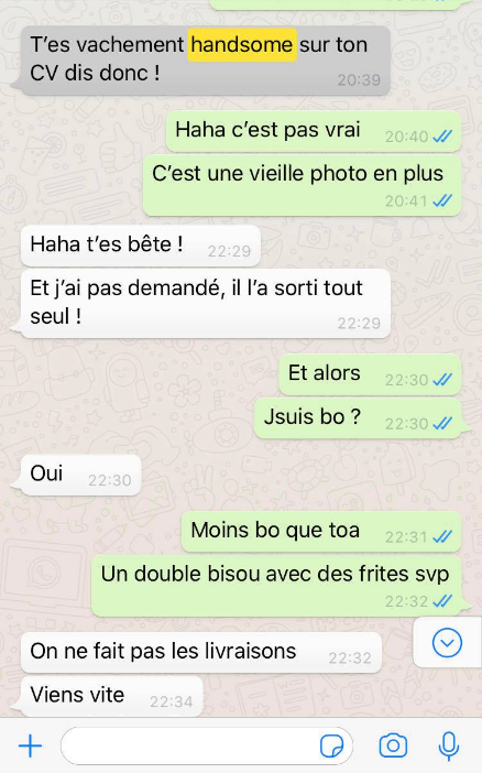 Une meuf que j'ai graillée une fois qui est partie en année sabbatique et qui est actuellement en train de bosser dans un snack au Costa Rica. Elle a mis une annonce sur ses réseaux comme quoi son boss recrutait et avait laissé le mail du boss. Pour montrer à ce pépito à quoi ressemble un vrai beau gosse à la française, j'ai envoyé mon CV au mec (sans prévenir la meuf). Le mec a dit à la meuf "Tiens, un français a répondu à l'annonce " et lui a montré mon CV. La meuf m'a répondu ça, et elle veut que je la rejoigne quand le confinement sera fini pour baiser et surfer comme des fous. C'est la fille d'un gros notaire parisien