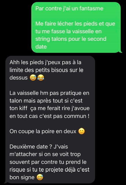 Demande lui si elle serait ok de te lécher les pieds et de faire ta vaisselle en string talons pour le second date