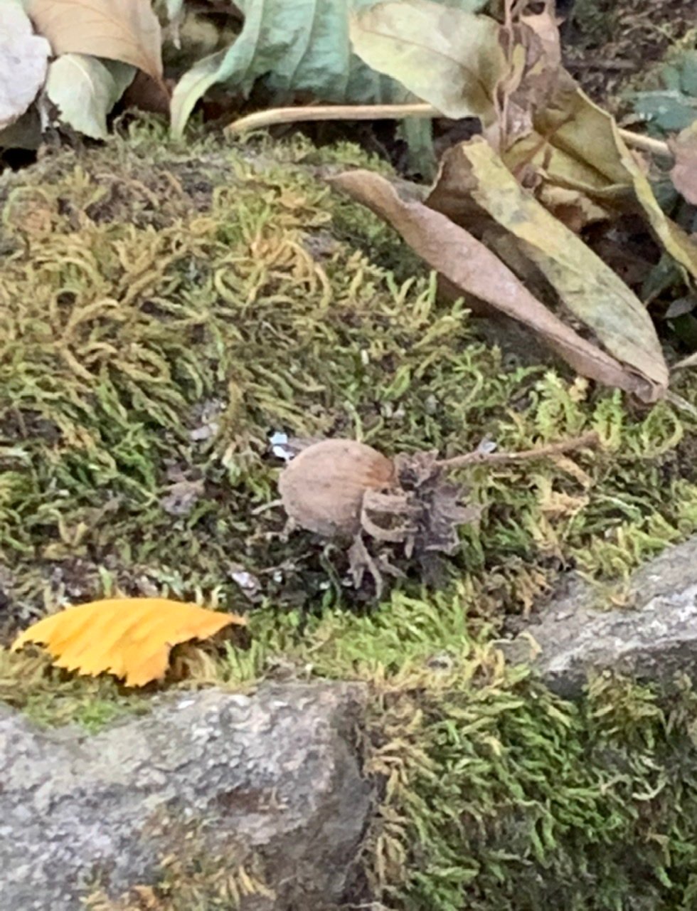 Je vois une noisette sur une pierre avec de la mousse et des feuilles