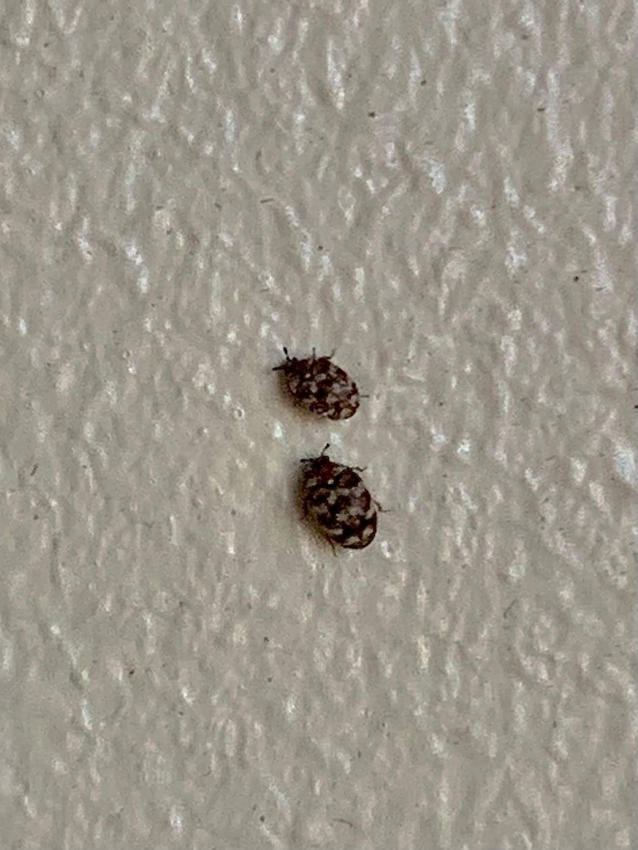 Visiblement c'est des anthrènes de tapis ("carpet beetle" en anglais), j'en ai déjà vu chez moi aussi. "il lui faut de un à trois ans pour passer de l’état de larve à celui d’adulte"