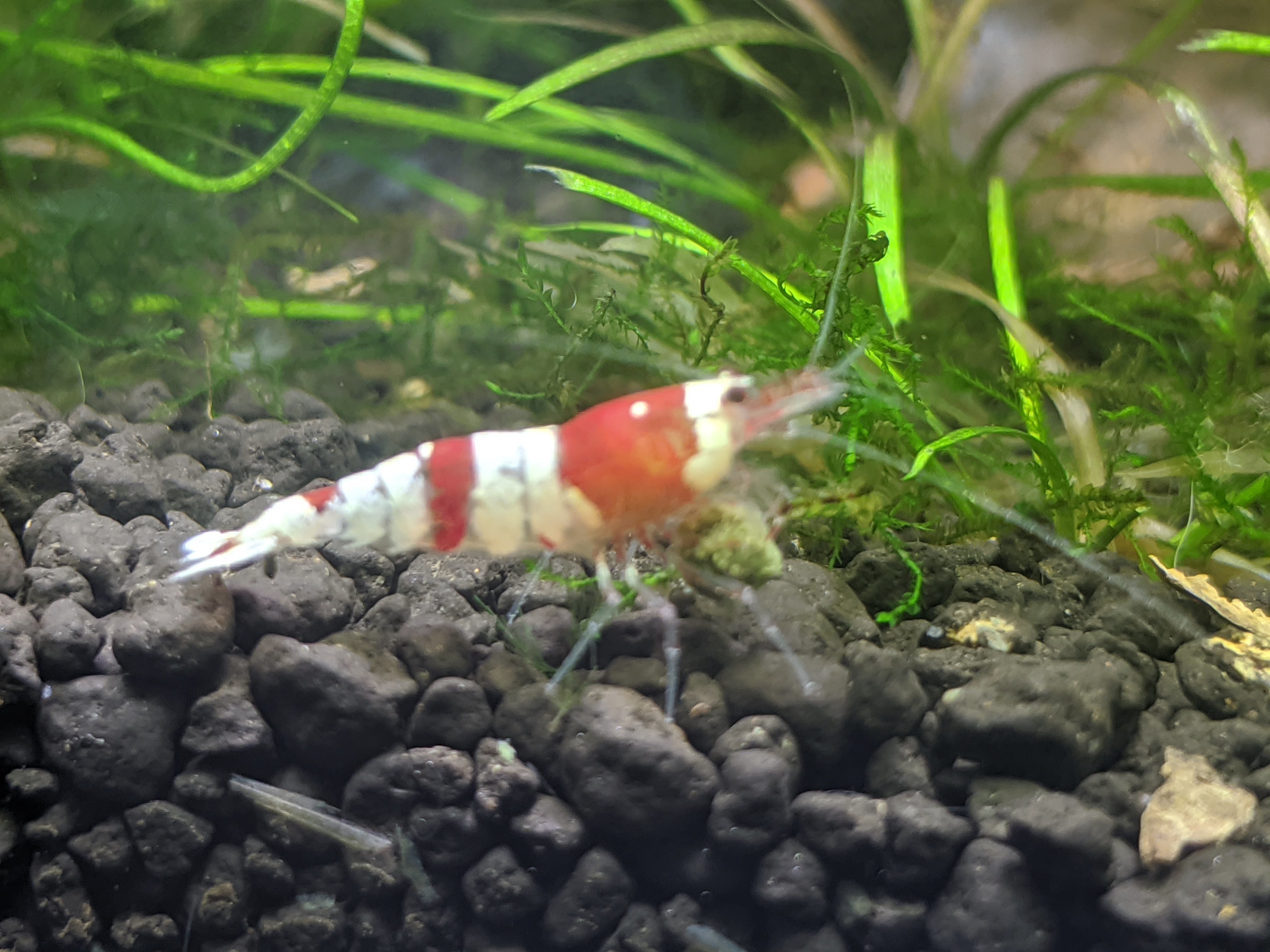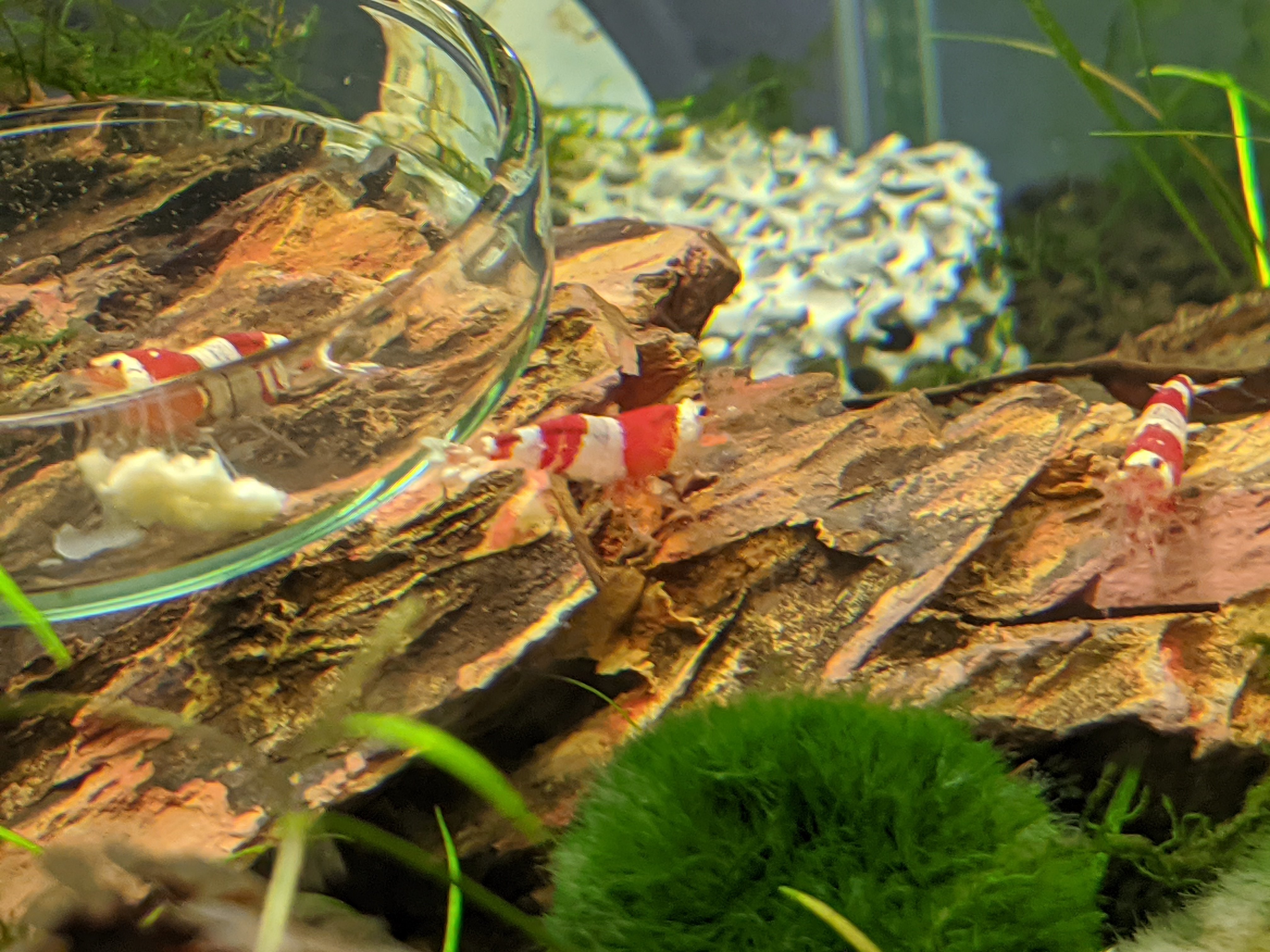 Le matériel de BASE : un aquarium en verre (obligatoirement et ce n’est pas à négliger) de 20 litres et plus, un thermos pour monter la température, un filtre opérationnel (je vous conseille une filtration par mousse+ pompe à air pour éviter que le filtre vous aspire vos futurs bébés crevettes), et évidement des plantes ça sera aussi utile que pour assurer un équilibre du bac que pour le bien être des crevettes en plus d’y apporter de la future nourriture pour elles il y a les mousses qui sont les plantes préférées des crevettes comme la mousse de java ou de noel, une lampe (franchement celles à 5 euros sur wish sont parfaites), de la nourriture adaptée trouvable en animalerie, et du matériel de maintenance : un sceau, un verre, une épuisette. Un sol est souvent conseillé pour le bien être de vos futures plantes mais ce n’est pas du tout obligé c’est aussi pour l’esthétique