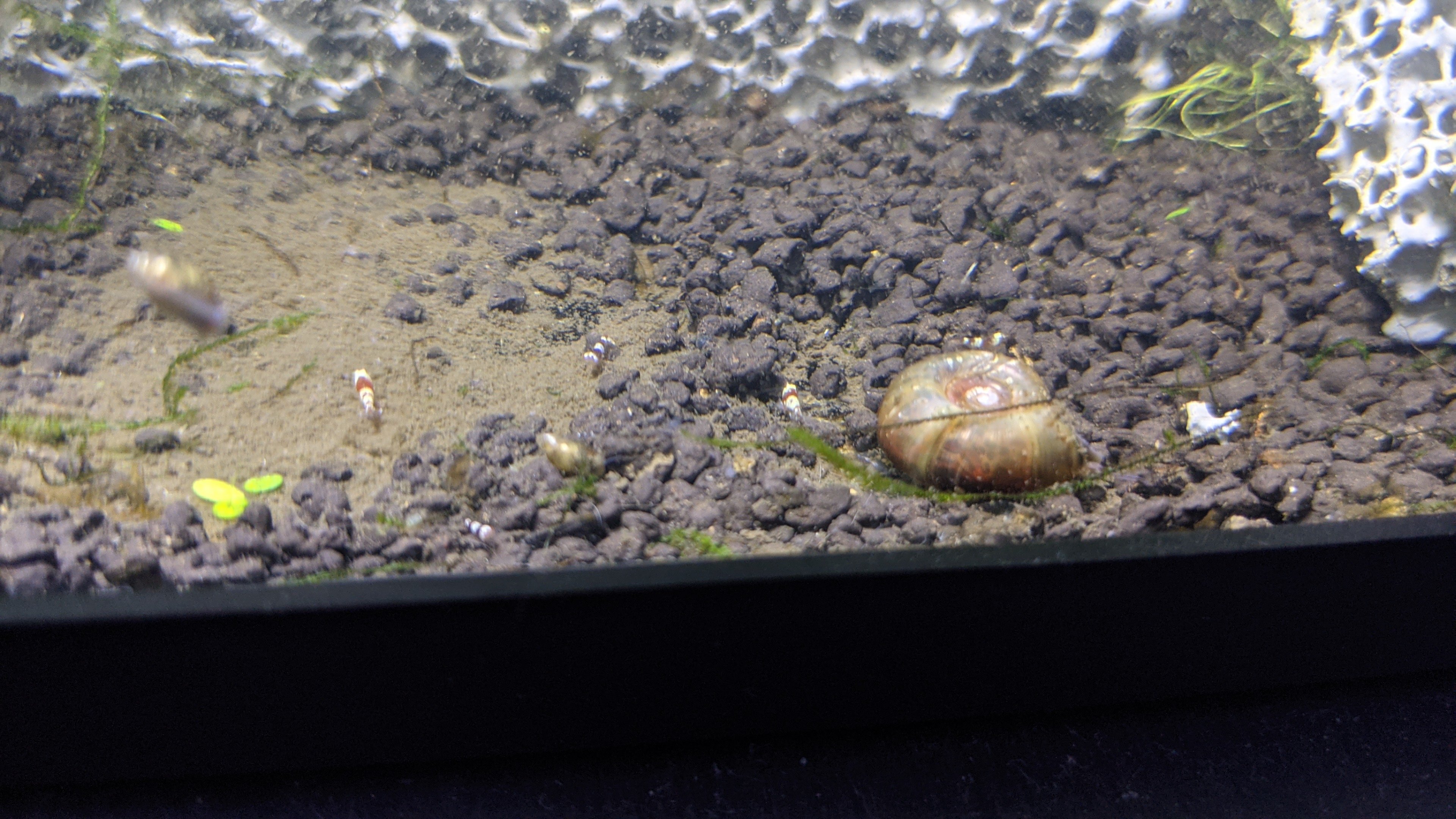 Filtre à l’arrêt depuis 4 mois, eau du robinet que je rajoute pour compenser l'évaporation, pas de chauffage, la bouffe en granule jbl spé crevettes... et un fond infame de saloperie.