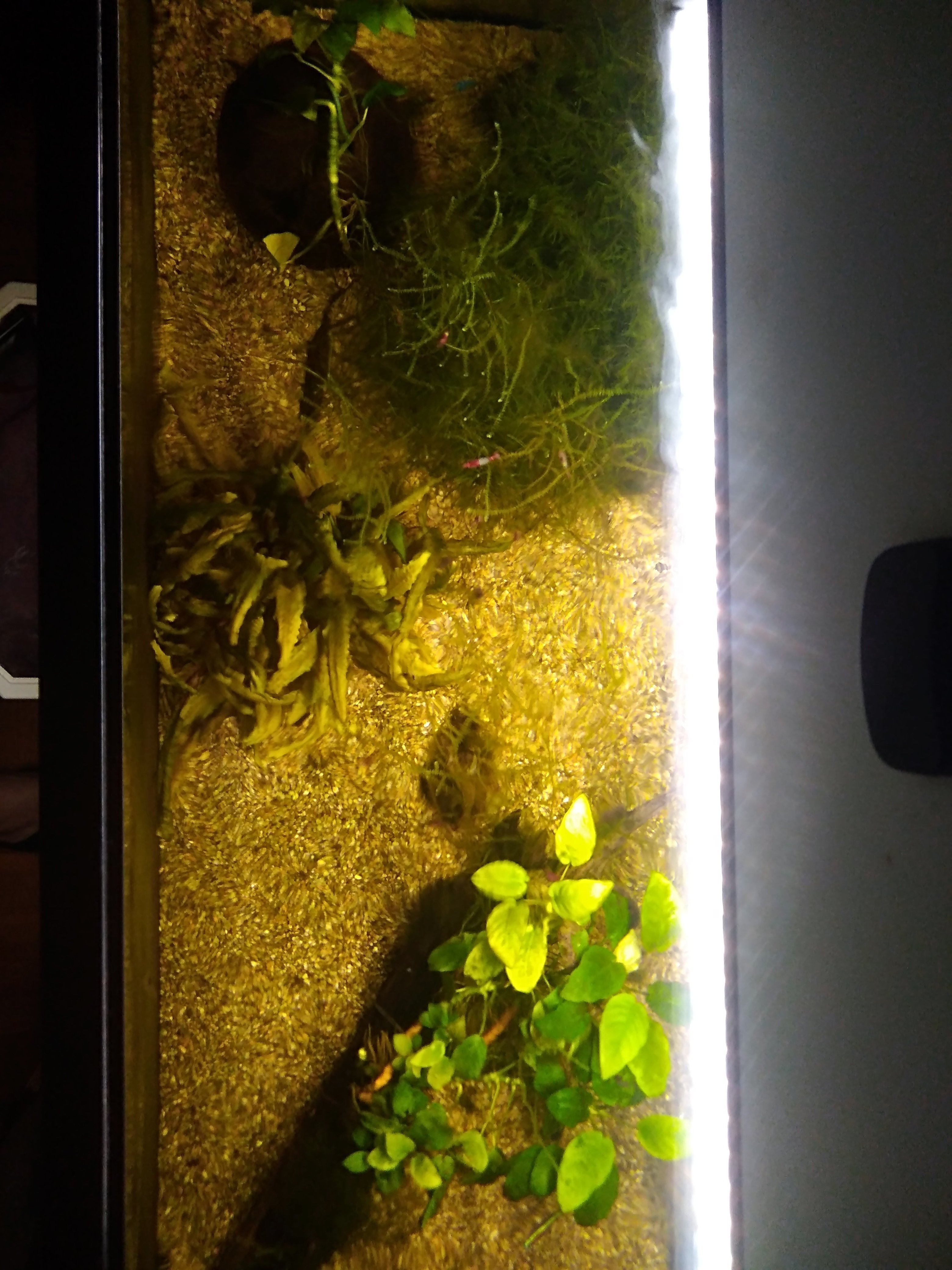 L'ensemble de mon aquarium, un 102l à la base c'était un aquarium pour neons rouges/corrydoras mais ils sont tous morts, il me reste 1 neon seulement