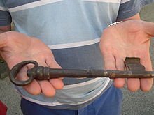 Et la voilà-t-il pas qu'il me sort une énorme clé noire en fer forgé !