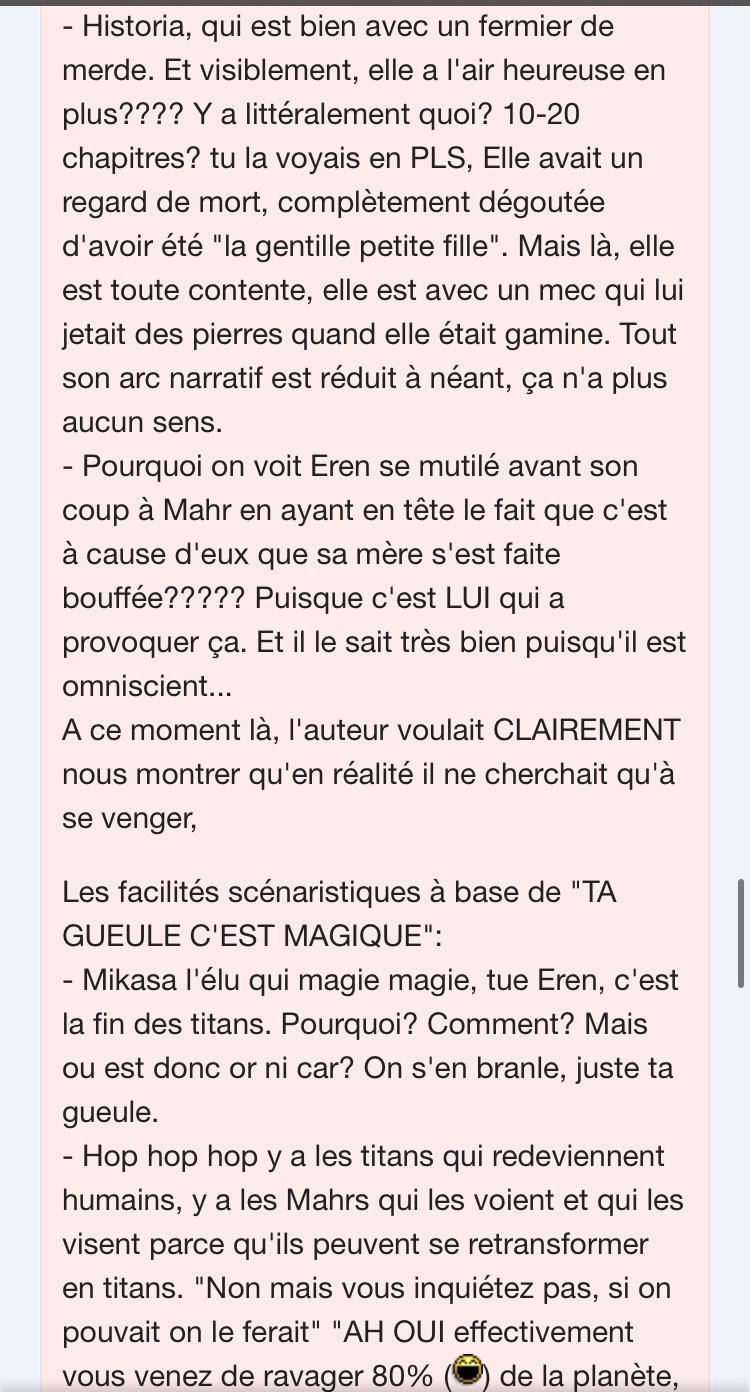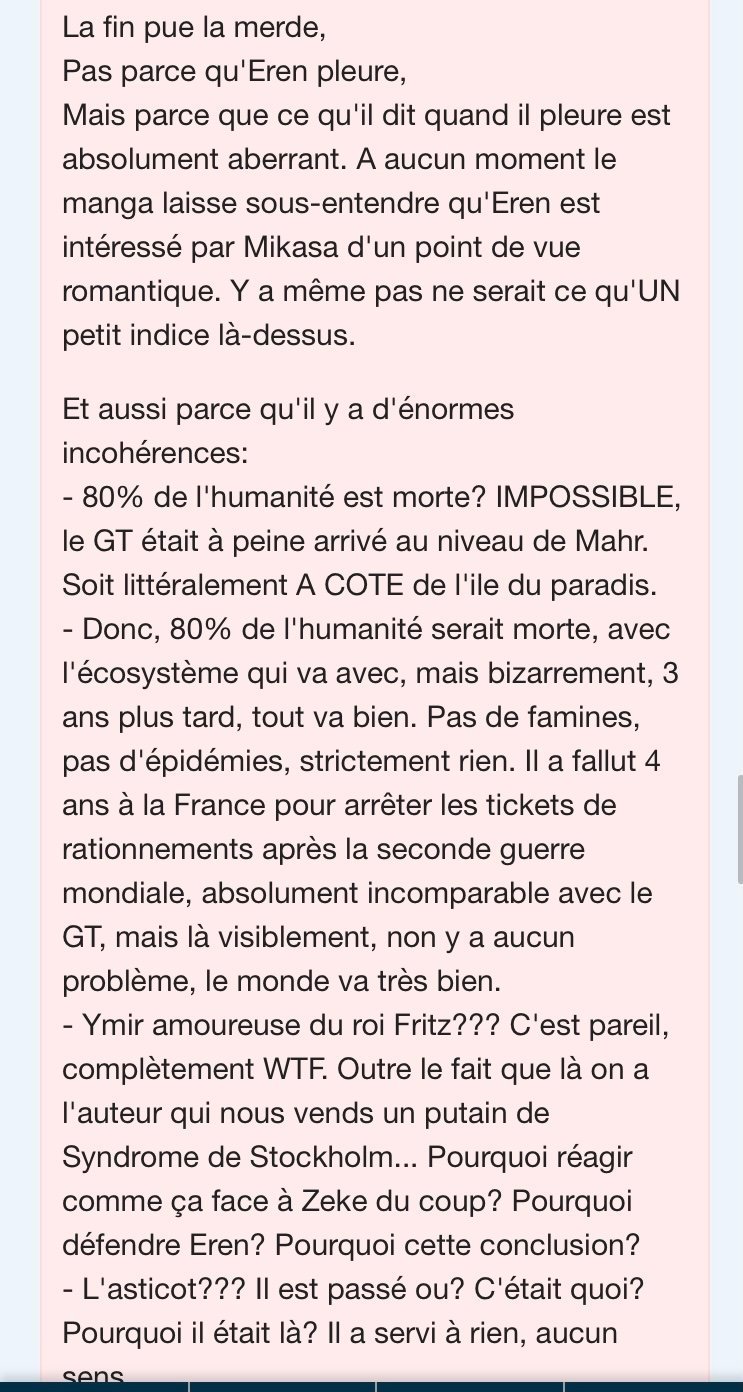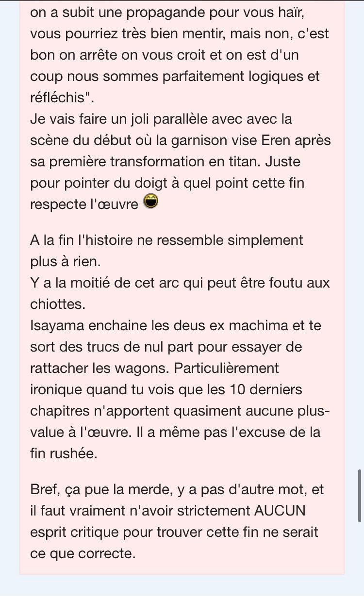 Je me suis déjà embrouillé avec le manga au moment de la véritable révélation de l'origine des titans, à ce moment là, le manga pour moi c'était n'imp, je ne faisais que le consommer pour le finir, ça reste une fin de merde et je le savais depuis longtemps.Là où j'ai été déçu c'est l'introduction du parasite. Je n'ai pas compris pourquoi l'auteur a fait ce choix, c'est un détail mais un pacte avec un démon c'était très bien, on aurait gardé le côté mystique des titans.