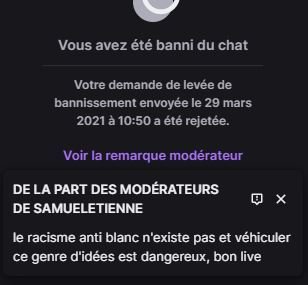 Je demande ce que ça ferait si on faisait des réunions où les noirs seraient autorisés mais devraient se taire (ce qu'a proposé Pulvar pour les blancs, débat des réunions de l'unef), je me prend un ban direct, je demande un deban en disant que je posais juste une question sans animosité et voilà la réponse du modo: