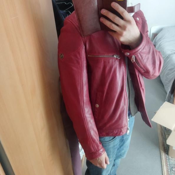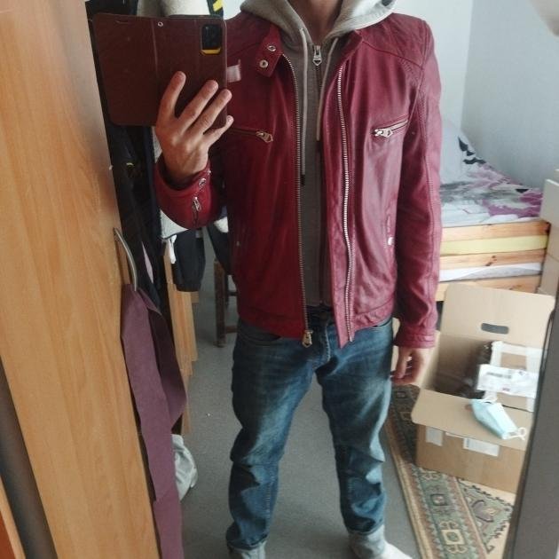 le jean pas à ta taille avec des ourlets dégueux, un manteau rouge délavé et mail taillé et une veste griste de prolo.