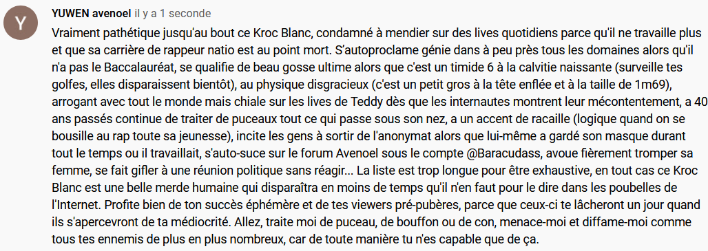 C'est un crétin, son cerveau s'est retourné en live lorsqu'il regardait des vidéos de l'affaire et il a fini par être tellement inintelligible au bout du compte que c'était à se demander s'il parlait vraiment français