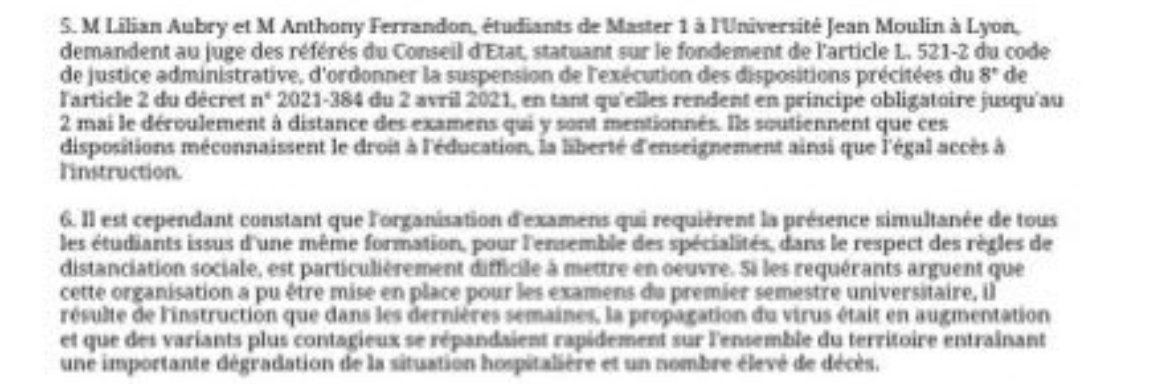 "le Conseil d’Etat reconnaît que l’organisation d'examens qui requièrent la présence simultanée de tous les étudiants issus d'une même formation, pour l'ensemble des spécialités, est « particulièrement difficile à mettre en œuvre »."En mode le 10 mai le Covid disparaît et que d’un coup c’est plus facile d’organiser des examens sans risque