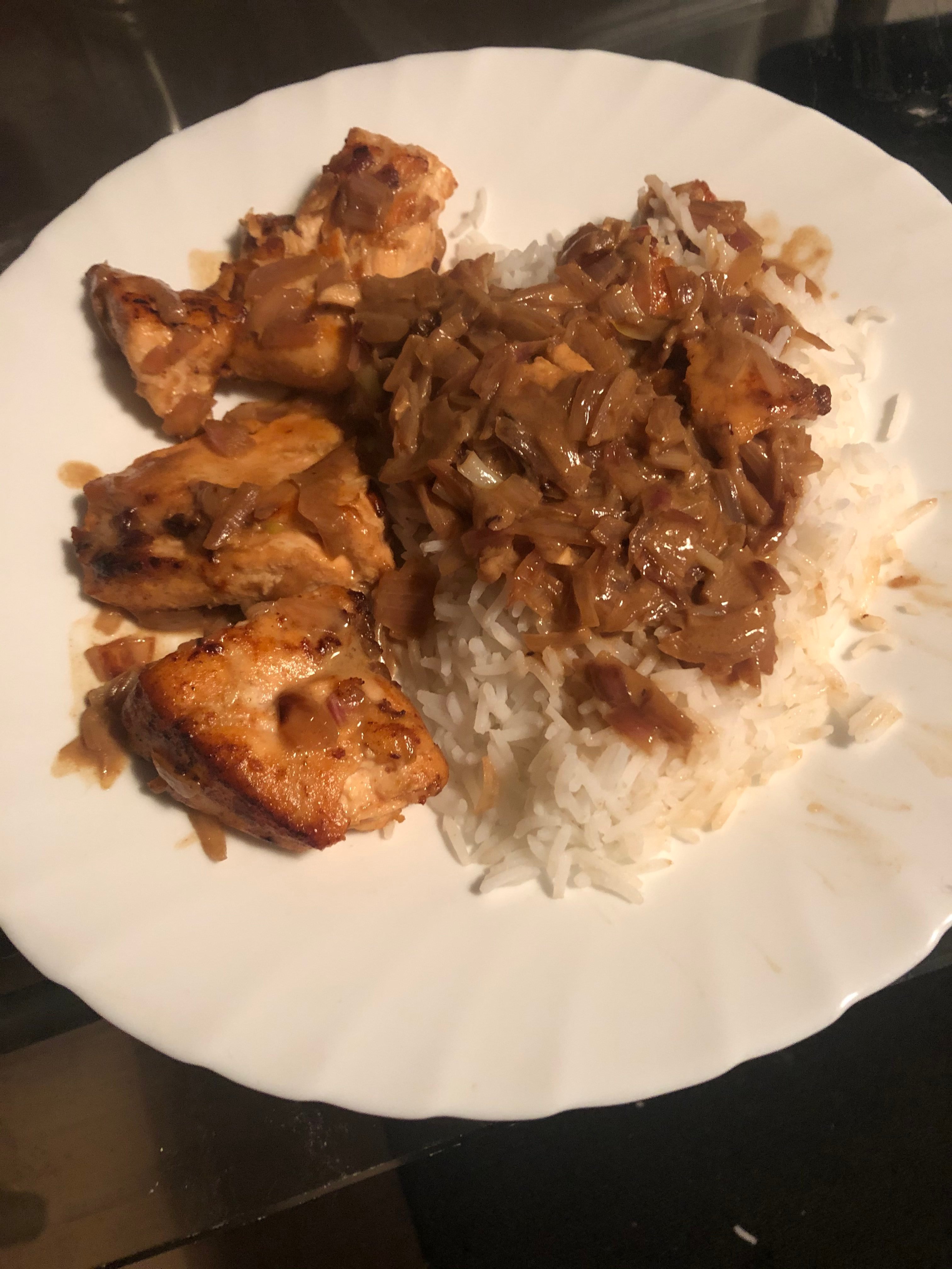 J’ai fait du riz avec du saumon accompagné d’une sauce aux échalotes et vinaigre balsamique