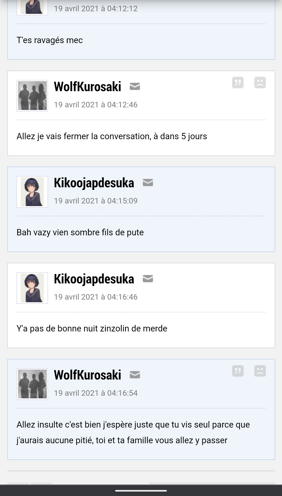 Le 19 avril 2021 à 15:04:41 :Il y a pas un khey complètement fou qui envoie des menaces de mort en MP à tout le monde ?