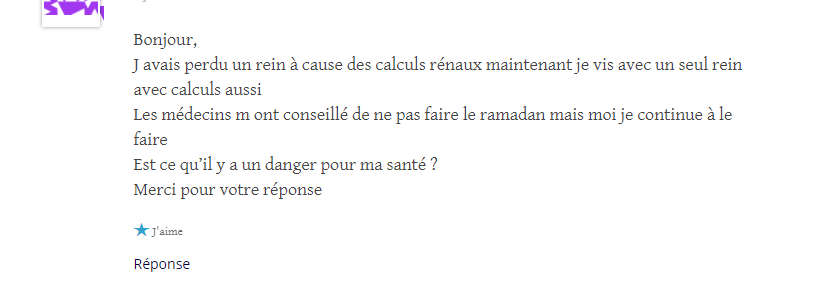 "j ai perdu un rein à cause du ramadan, puis-je continuer à le faire ?"J avais un pote en terminale en cours de sport "je me sens pas bien je vais m'évanouir