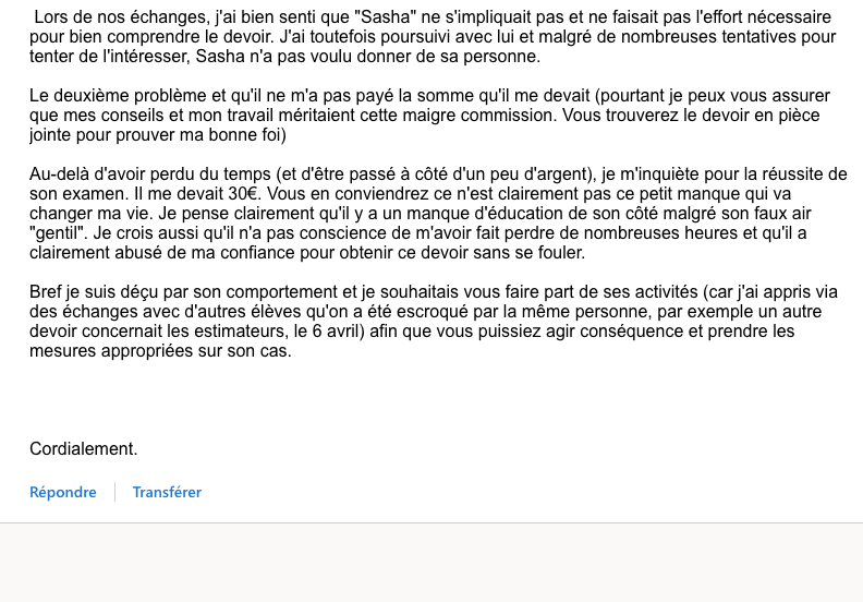 Bien entendu, Sacha ne paye pas, l'auteur envoie donc un mail à sa prof qui lui explique avec un beau petit pavé que Sacha a triché (et l'a arnaqué) avec des preuves en pièces jointes et qu'il n'en est pas à sa première fois