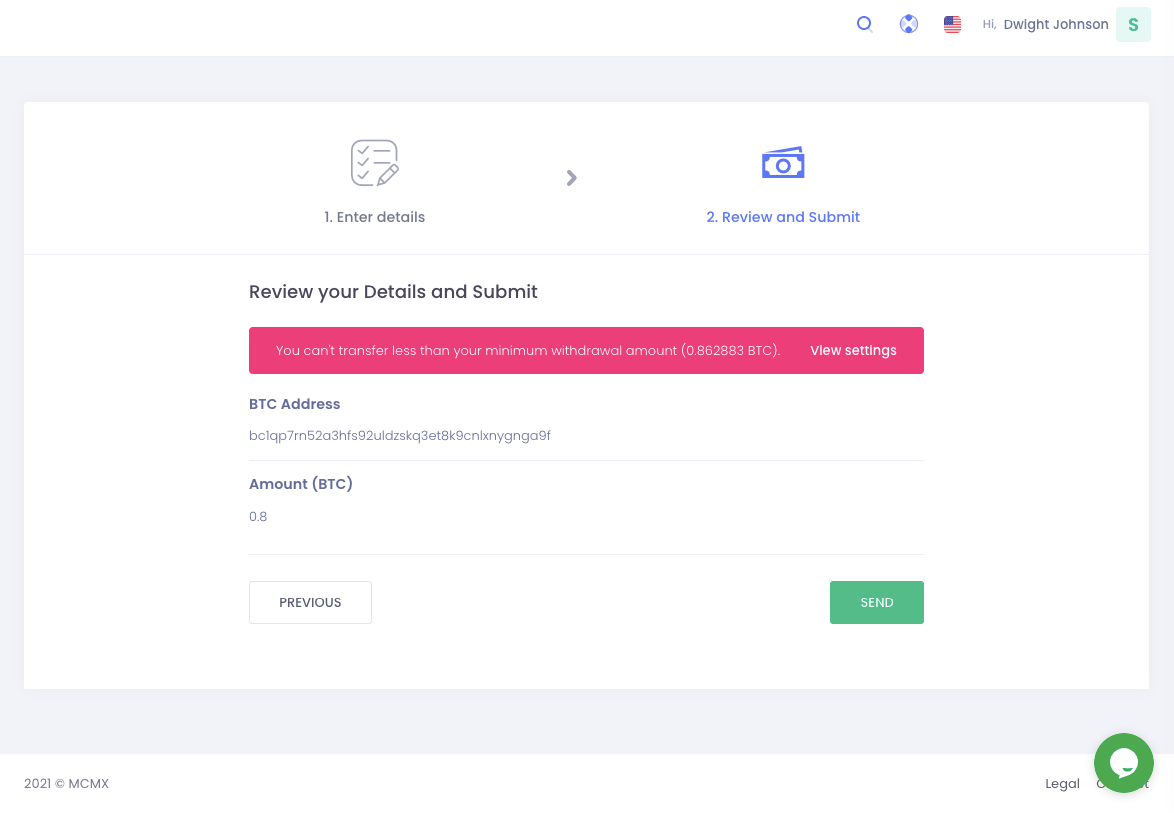 Mince il faut déposer 0.862883 - 0.862783 = 0.001 BTC = 5 euros