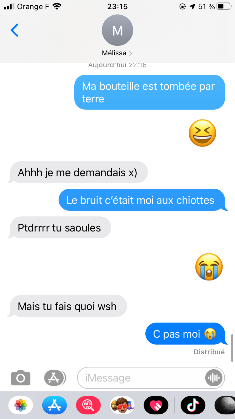 Je pensais que c'était elle donc j'ai continué mes trucs sur l'ordi, puis elle m'a envoyé un message car elle croyait que c'était moi qui faisait le bruit