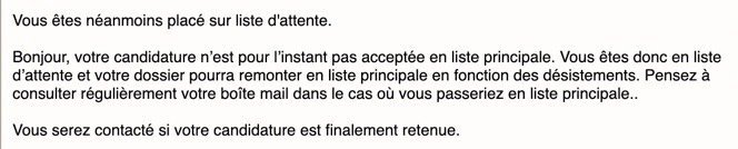 Je suis pas rang 13 j'ai reçu 2 mails, l'un m'indiquant rang 13 et le suivant me disant que je suis refusé