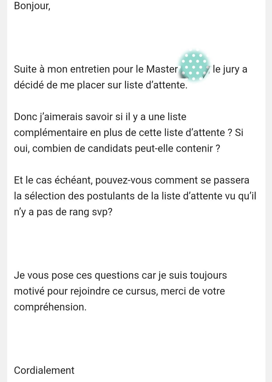 Ah et autre chose, vous savez si les délibérations après entretien sont rapides ? Car si je suis pas pris je dois valider un autre master pour lequel je suis pris mais c'est pas mon premier choix. Ou sinon est ce que je peux accepter ce master pour finalement me désister et laisser ma place quand j'aurais la réponse de mes premiers choix après entretien ?